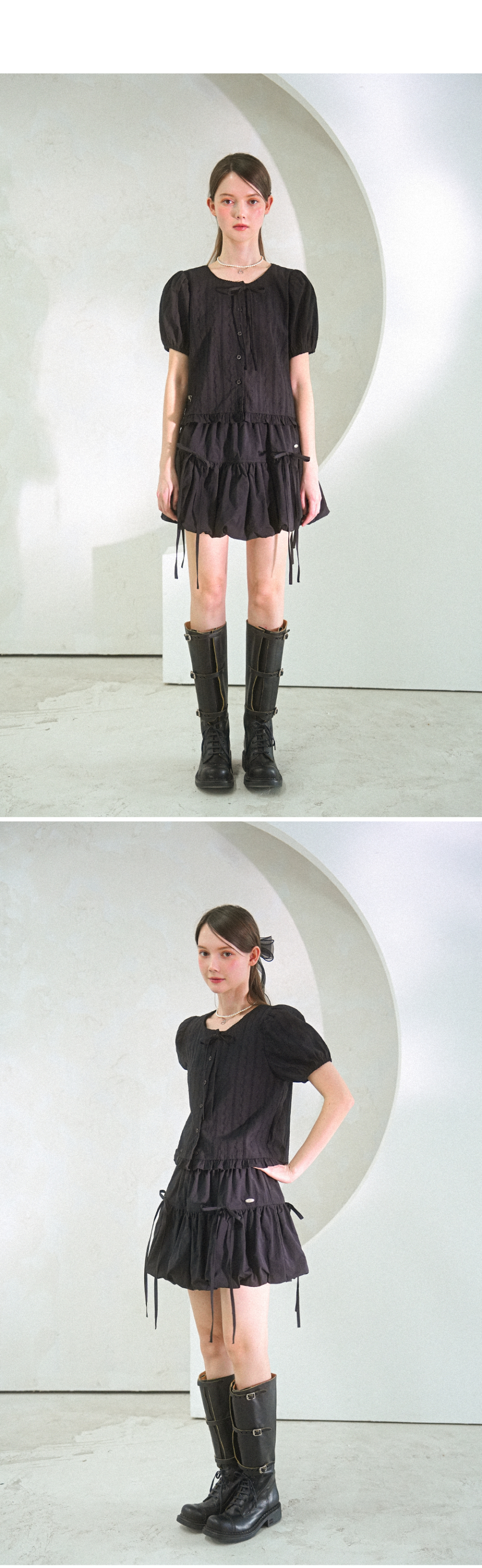 레이어드 스트랩 도트 프릴 반팔 블라우스 셔츠 _ 2COLOR