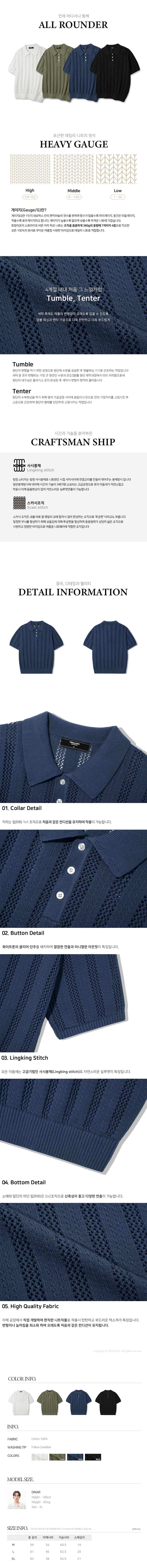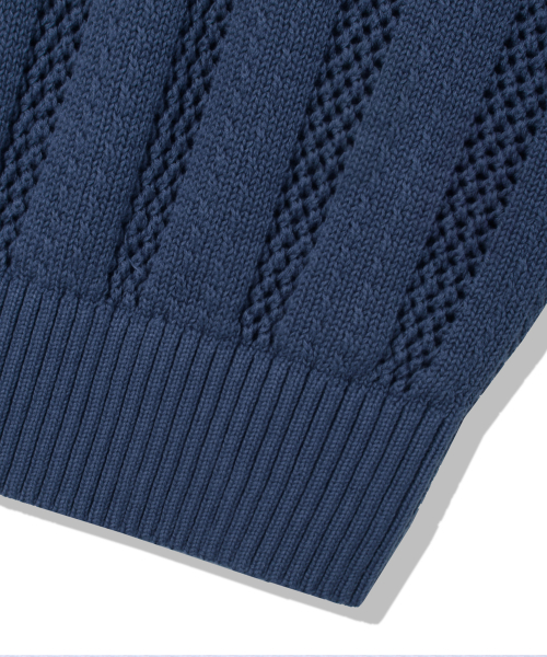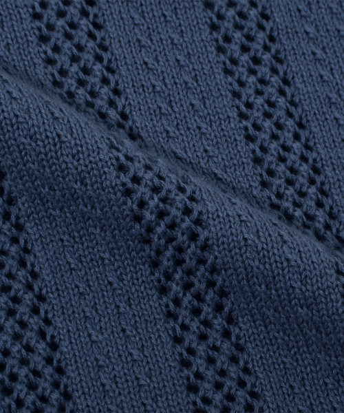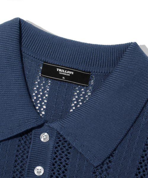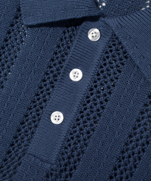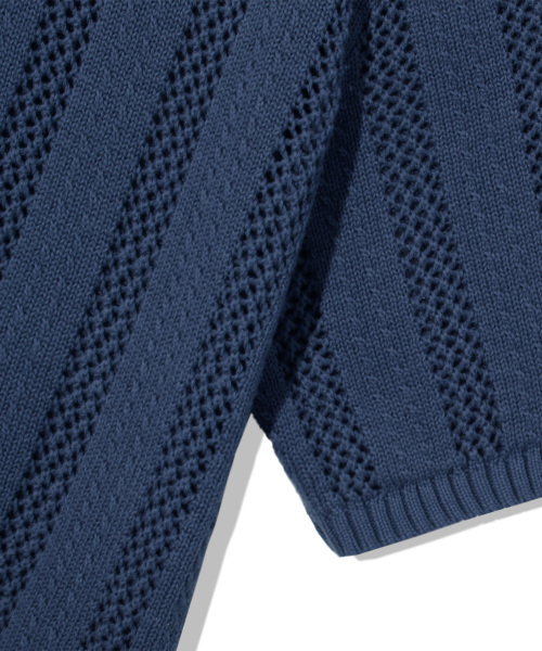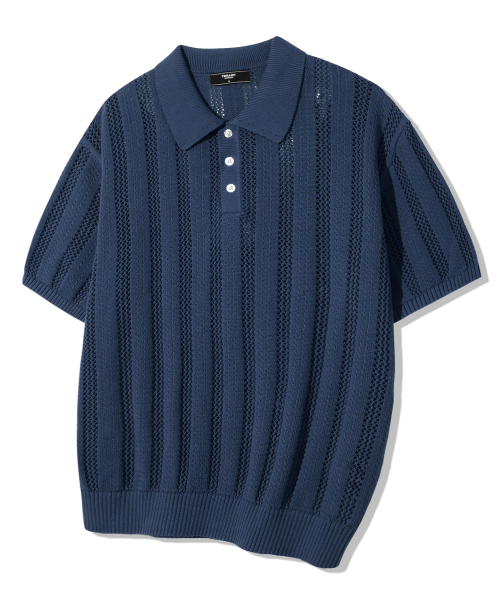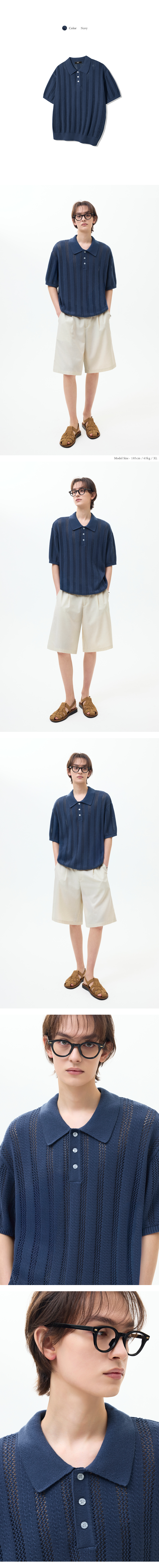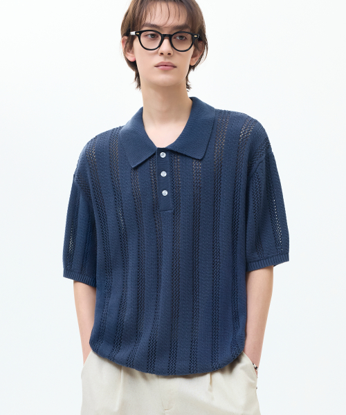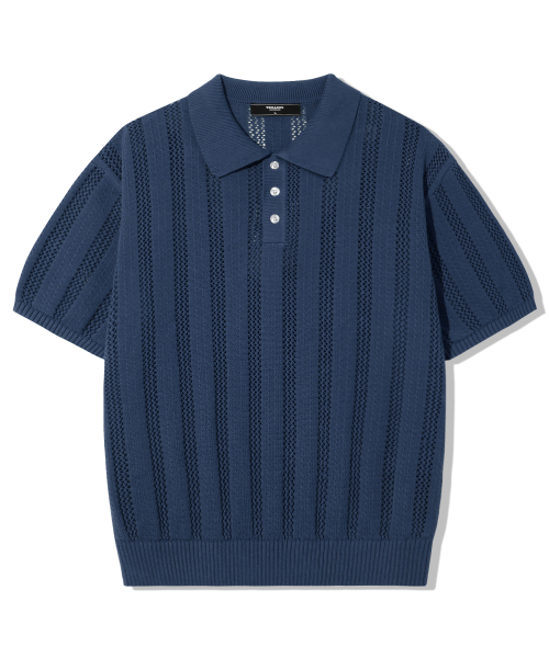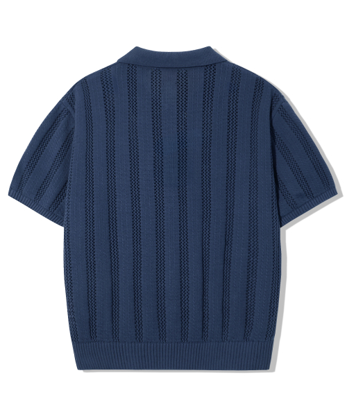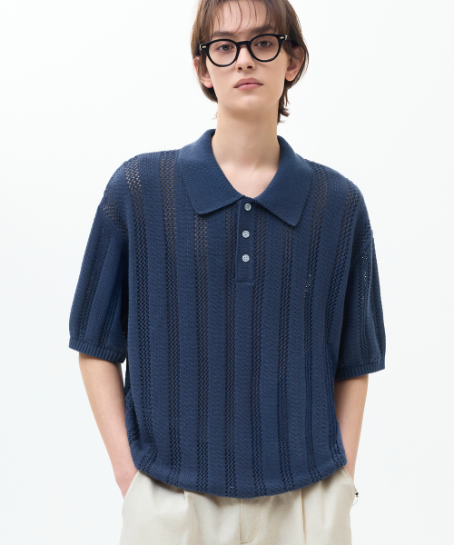 스트라이프 스카시 버튼 카라 반팔 니트 [네이비]