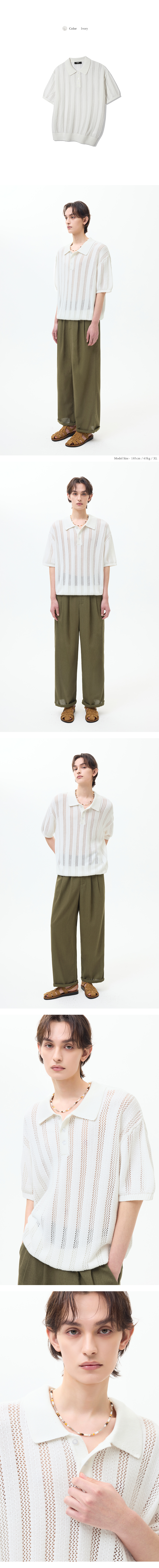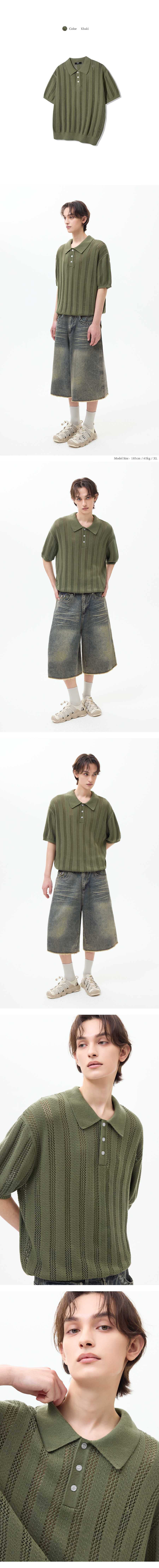 스트라이프 스카시 버튼 카라 반팔 니트 [카키]