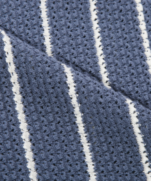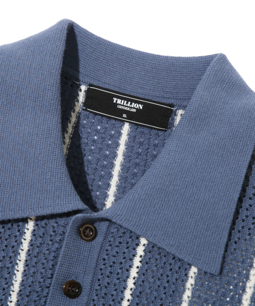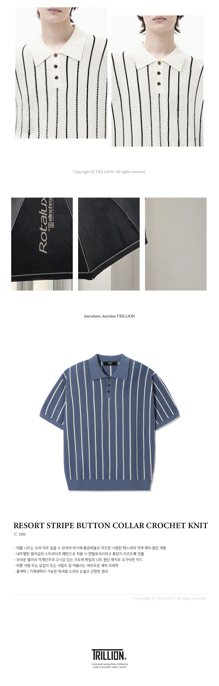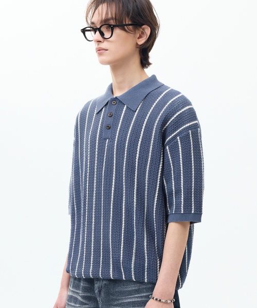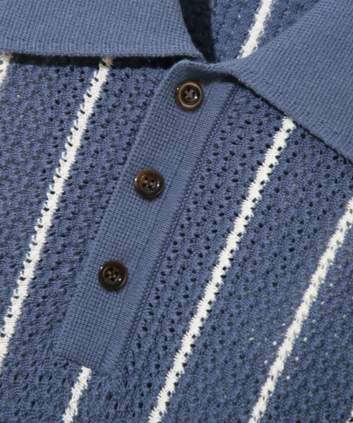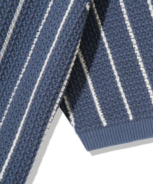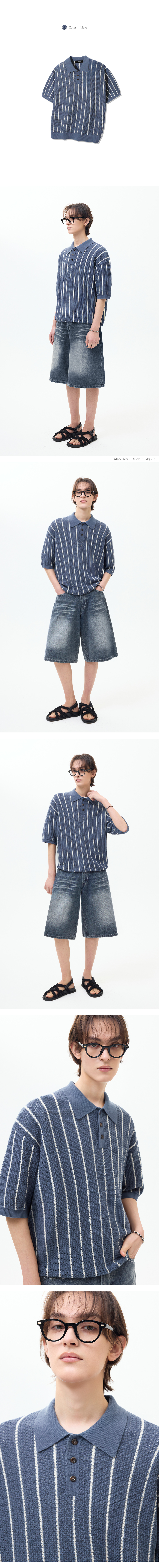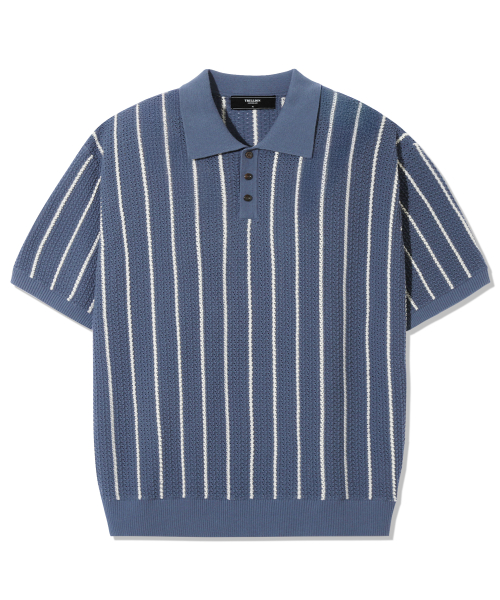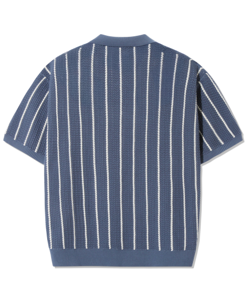 리조트 스트라이프 버튼 카라 크로셰 반팔 니트 [네이비]