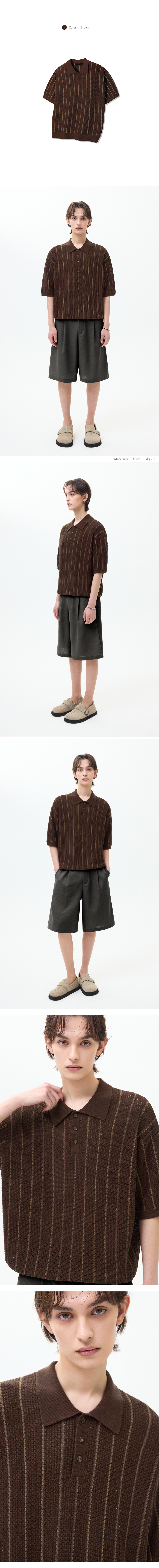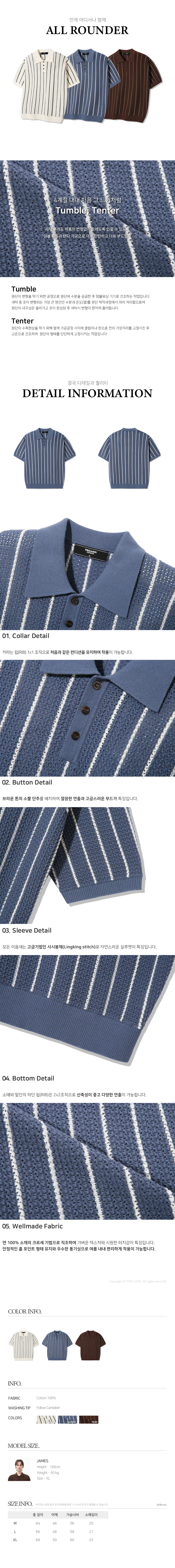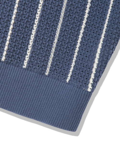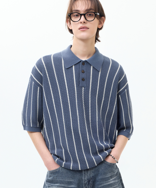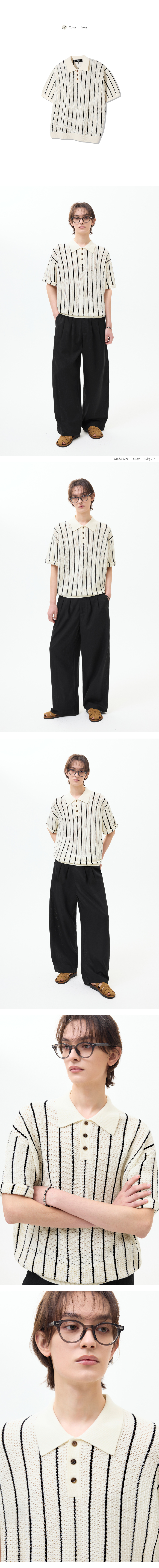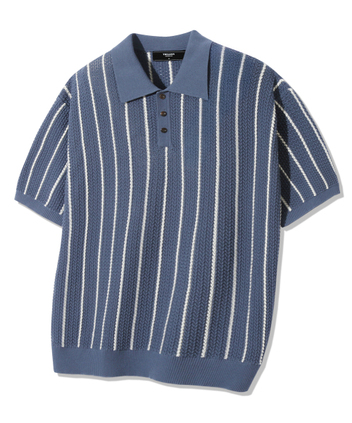 리조트 스트라이프 버튼 카라 크로셰 반팔 니트 [네이비]