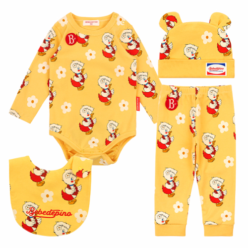 베베드피노 올 오버 할리 베이비 바디수트 세트입니다. 귀여운 Yellow 컬러의 신축성이 뛰어난 Cotton span 소재로 제작했습니다. 25SS 오브제인 Halii 그래픽을 롤프린팅하여 제작했습니다. 전체적으로 기본적인 핏의 바디수트는 왼쪽 어깨와 밑단에 트임을 준 후 스냅 처리하여 입고 벗기에 용이합니다. 모자에는 동그란 귀를 달아 귀여움을 더해주었으며, 레깅스는 허리 부분 전체를 밴딩 처리하여 아이들이 입고 활동하기에도 편안함을 줍니다. 모자, 빕, 수트, 레깅스 4가지가 세트로 구성된 상품으로 활용도가 높은 아이템입니다.