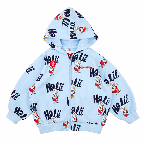 베베드피노 올오버 할리 후드 집업 자켓입니다. 파스텔톤의 S.BLUE 컬러의 Cotton 혼방 소재에 이번 시즌 베베드피노만의 귀여운 Halii 오브제를 전판 롤 프린팅하여 제작하였습니다. 정면에는 이번 시즌 베베드피노 레터링 자수와 B와펜으로 포인트를 주었습니다. 전체적으로 방방한 실루엣으로 캥거루 포켓과 후드가 포인트인 아이템입니다.