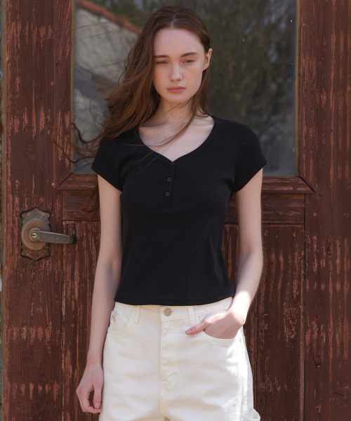 A HENLEY NECK RIBBED T-SHIRT_BLACK