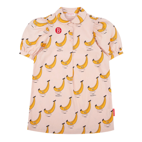 베베드피노의 올 오버 바나나 퍼프 슬리브 카라 드레스입니다. Peach 컬러의 부드러운 코튼 레이온 소재를 사용하여 제작하였습니다. 23SS 오브제인 Banana를 전면에 프린트하여 포인트를 주었습니다. 라운드 카라와 퍼프 소매로 귀여운 감성을 더해주었습니다. 여아들의 러블리한 데일리 룩으로 연출이 가능합니다.