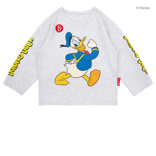 베베드피노 도널드 덕 롱 슬리브 티입니다. Donald duck X Bebedepino 콜라보 제품입니다. M.gray 컬러의 도톰한 Cotton 원단으로 제작했습니다. 앞판과 소매부분에 깜찍한 Donald duck 오브제가 포인트나염으로 들어가있습니다.