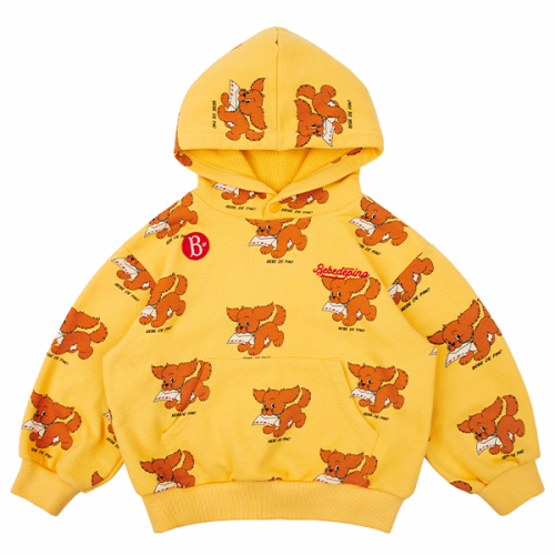 베베드피노 올오버 딜리버리 퍼피 후디 스웨트셔츠입니다. Yellow 컬러의 부드러운 Cotton Poly 혼방 원단을 사용하여 제작했습니다. 이번시즌 베베드피노만의 귀여운 Delivery puppy 오브제를 전판 롤프린팅하여 디자인했습니다. 후드부분 앞중심에는 스냅 잠금 가능하도록 했고, 앞판 캥거루 포켓이 포인트입니다.