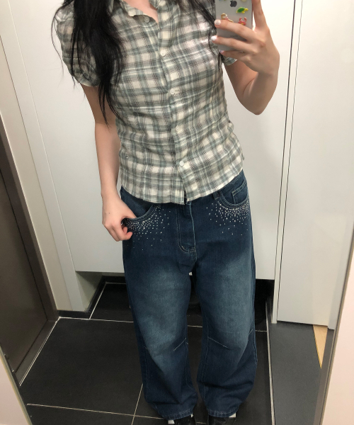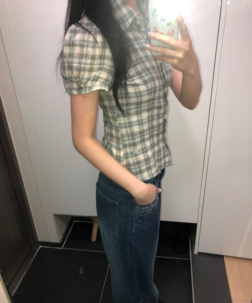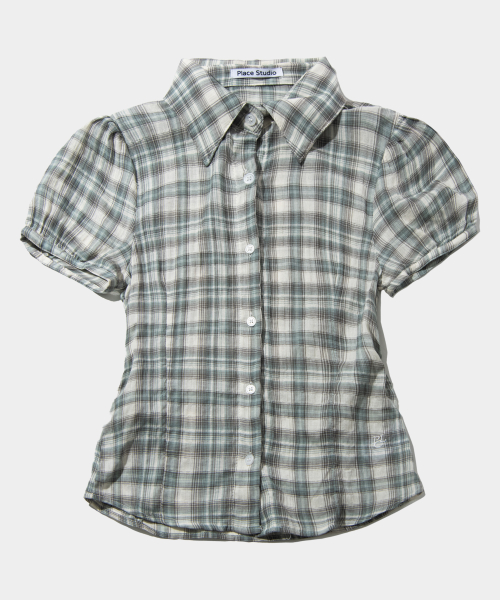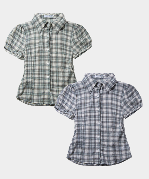 퍼프 소매 링클 로고 자수 코튼 반팔 체크 블라우스 셔츠_2COLOR