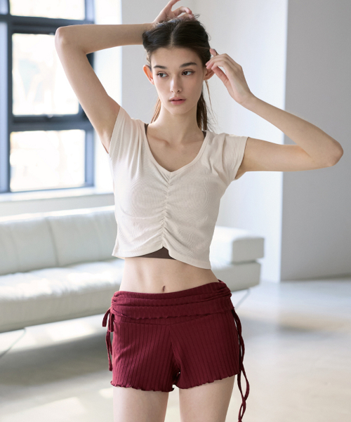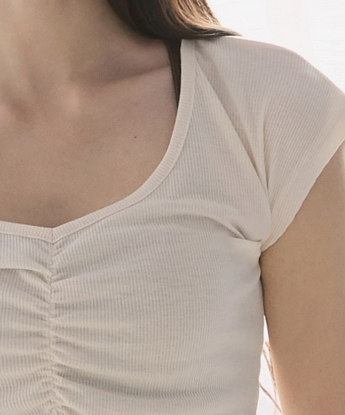 여성 요가복 DEVI-T0130-크림 필라테스 줄리 셔링 캡 슬리브