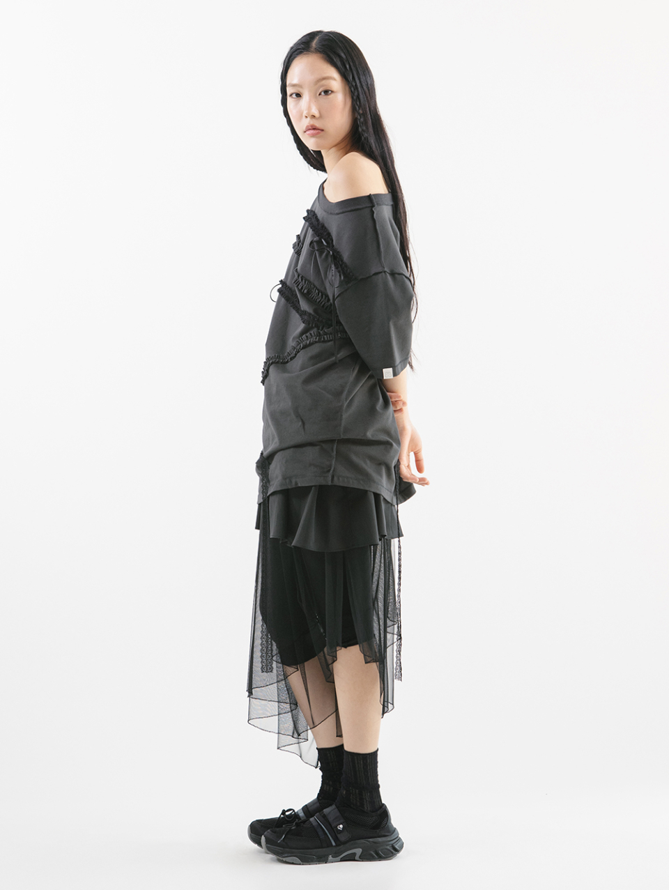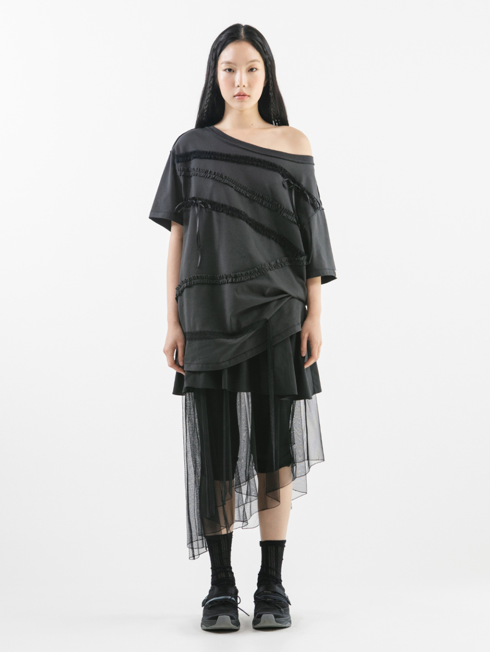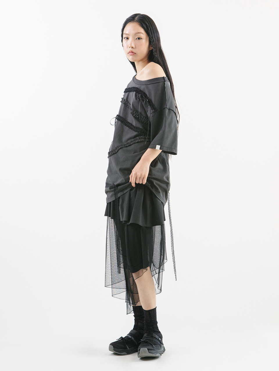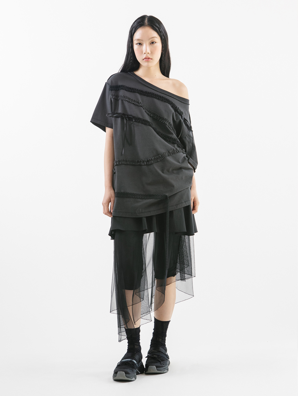 LACE STRAP OVERSIZED T-SHIRT [CHARCOAL]