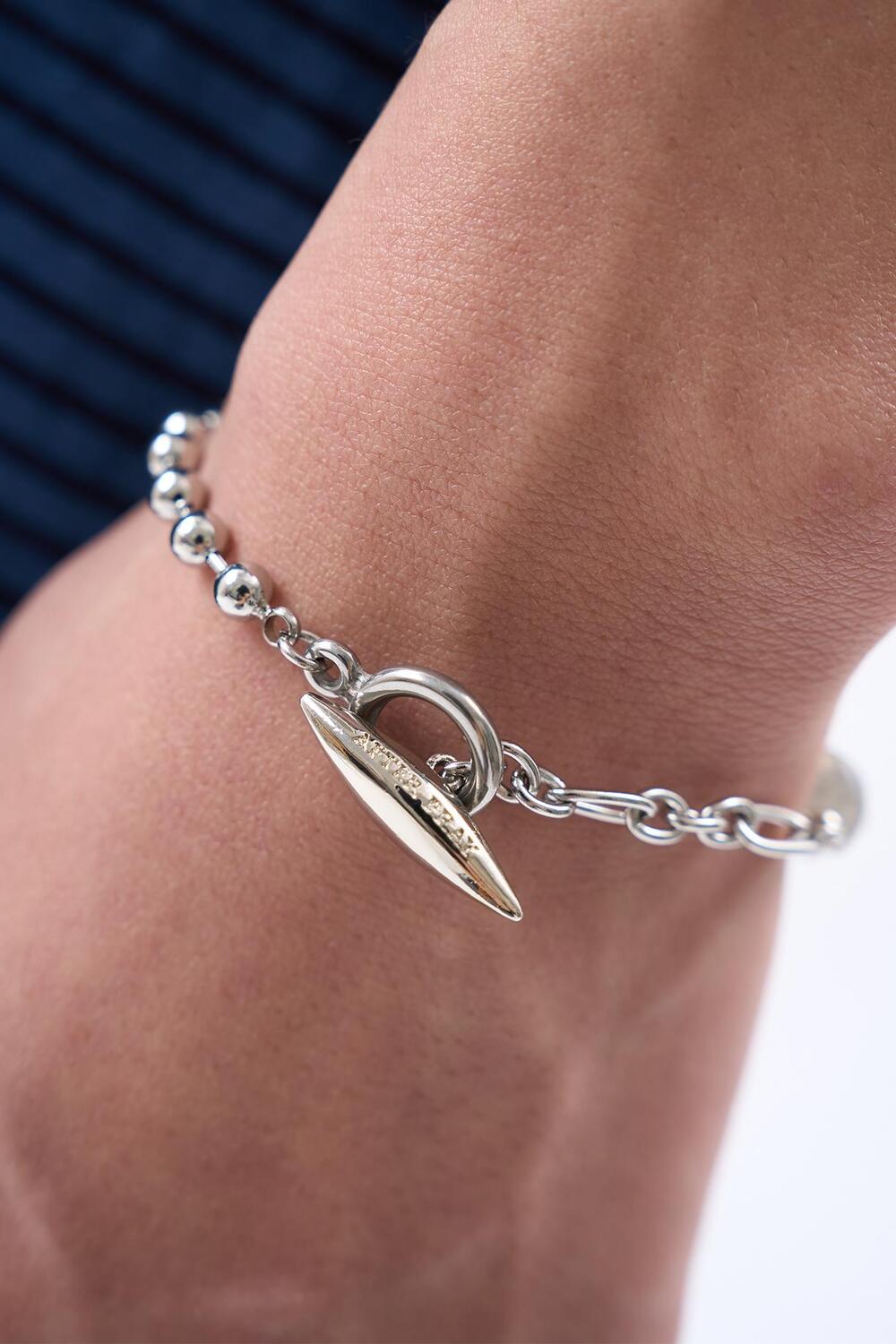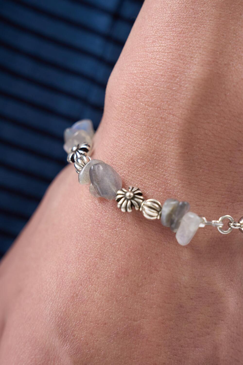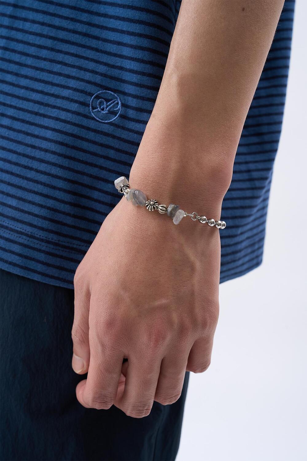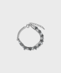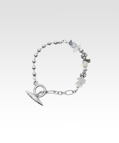 플라워 형태의 실버 비즈와 그레이 톤 천연 원석을 조합한 플라워 비즈 체인 브레이슬렛입니다. 서로 다른 두 가지 체인을 믹스 매치해 감각적인 스타일링이 가능하며, 다양한 룩에 유연하게 어우러지는 높은 활용도를 자랑합니다. 더플 참에서 모티브를 얻어 개발한 로고 바 장식이 위트 있는 마무리를 더해줍니다.