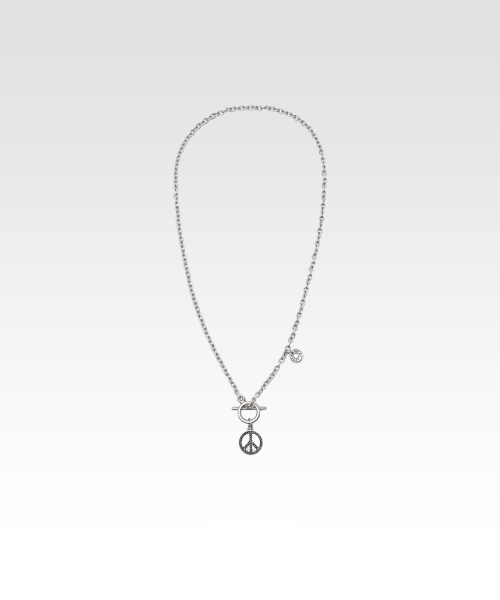 컬렉션 테마 ‘LOVE’를 모티브로 디자인된 피스 러브 네클레이스입니다. 사랑이 있는 곳에 진정한 평화가 깃든다는 메시지를 스터드 디테일로 재해석한 펜던트에 담았습니다. 펜던트를 연결하는 더플 바 형태의 디테일은 유니크한 매력을 더하며, 존재감을 깊이 있게 완성합니다.