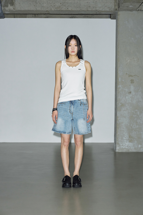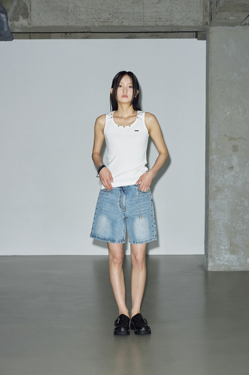스타일리시한 스터드 디테일이 포인트인 슬리브리스 탑입니다.