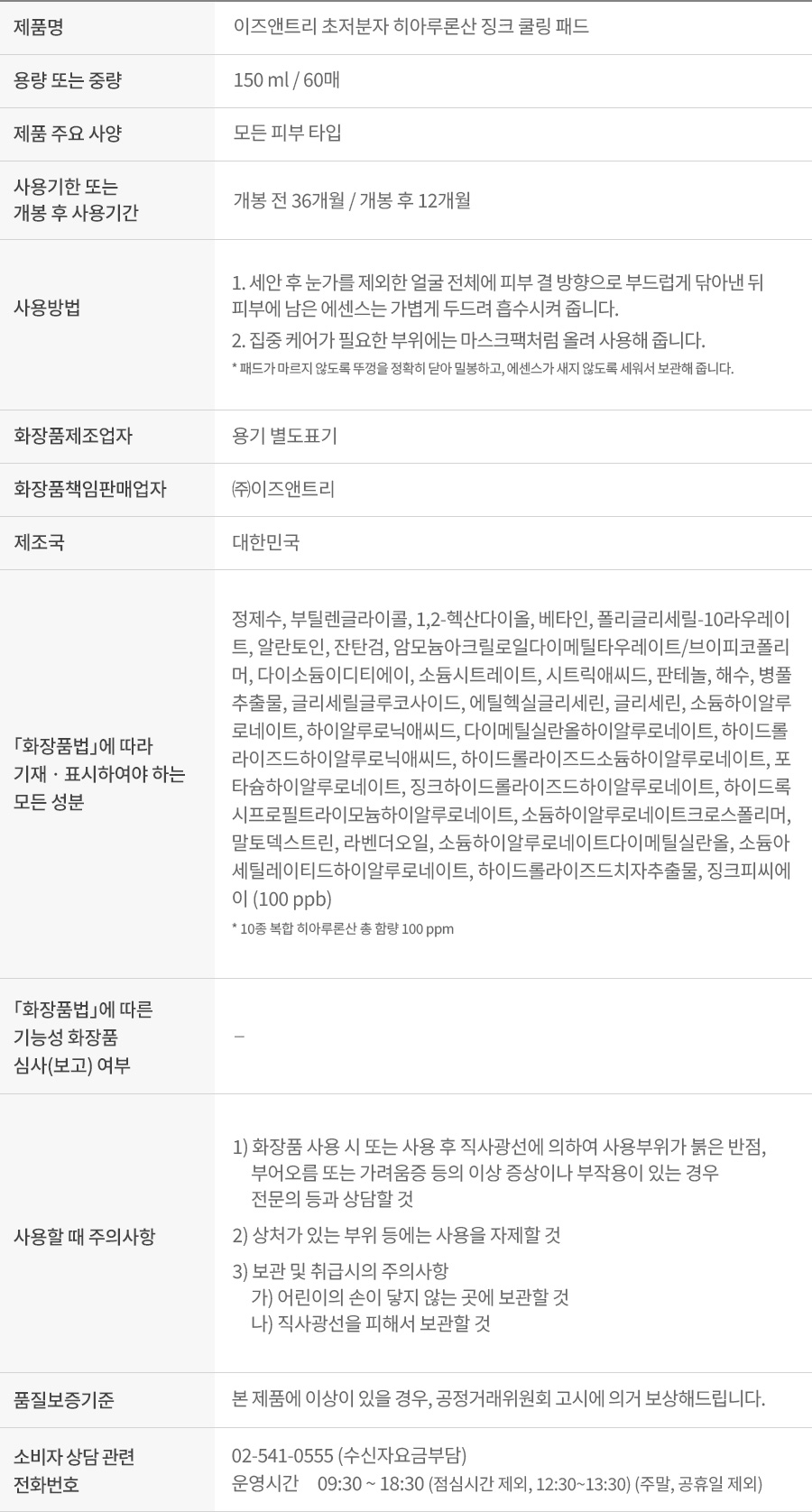 [2PACK] 초저분자 히아루론산 징크 쿨링 패드 60매