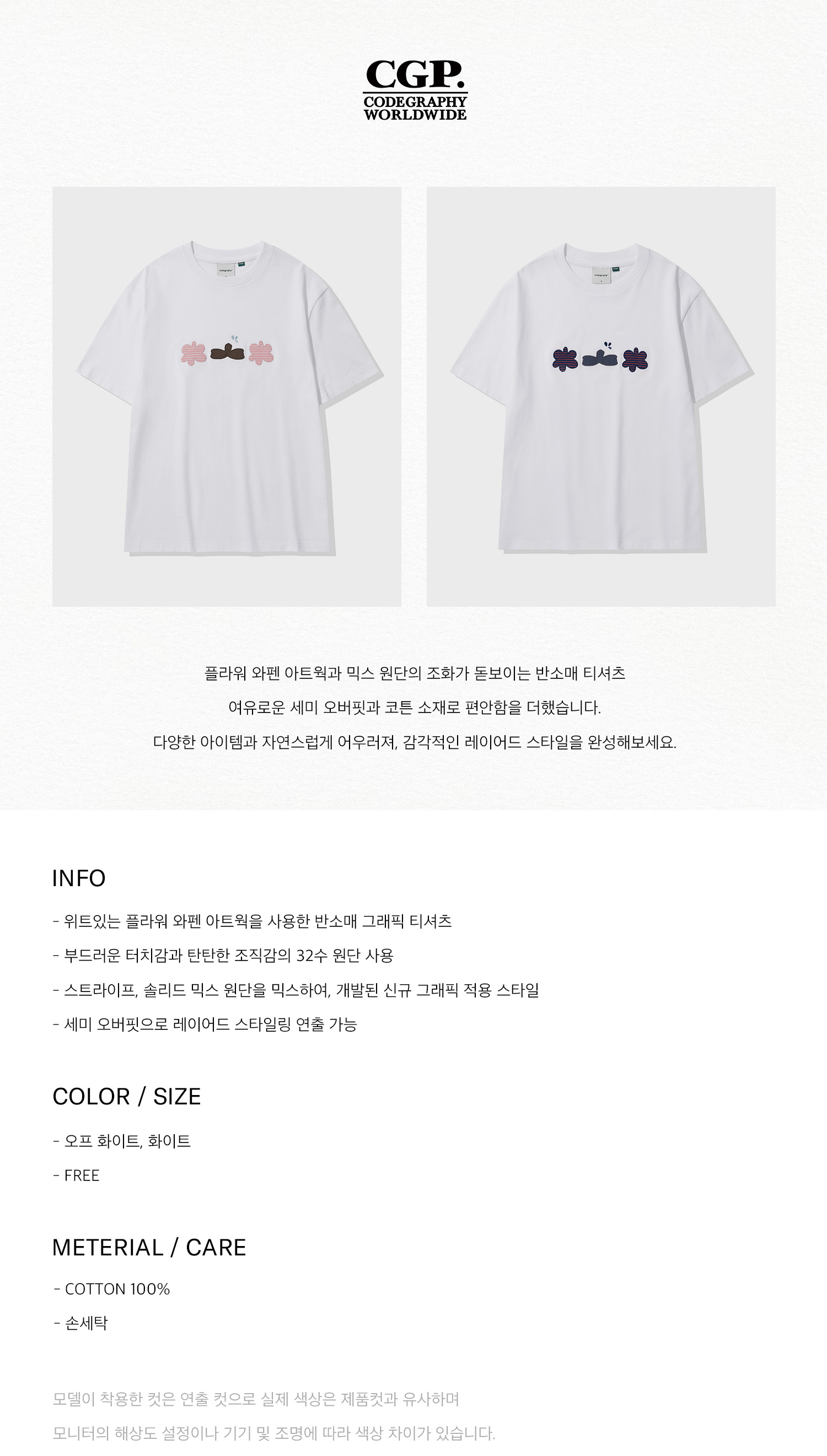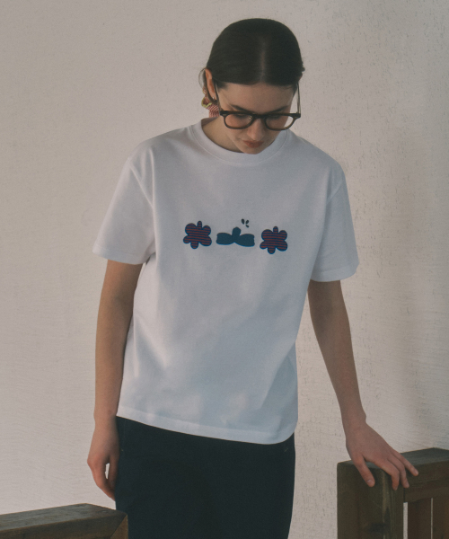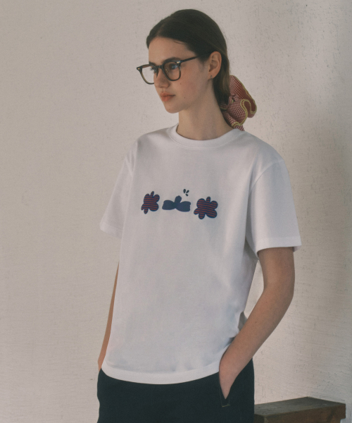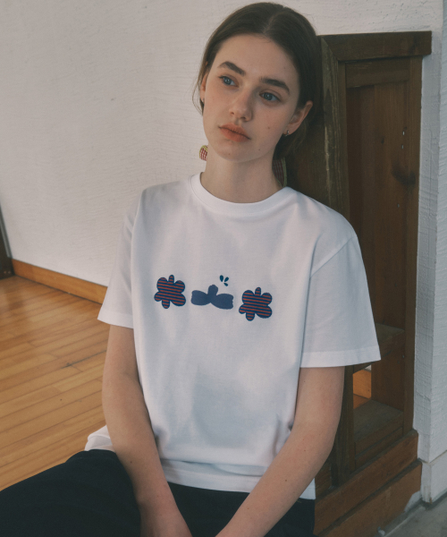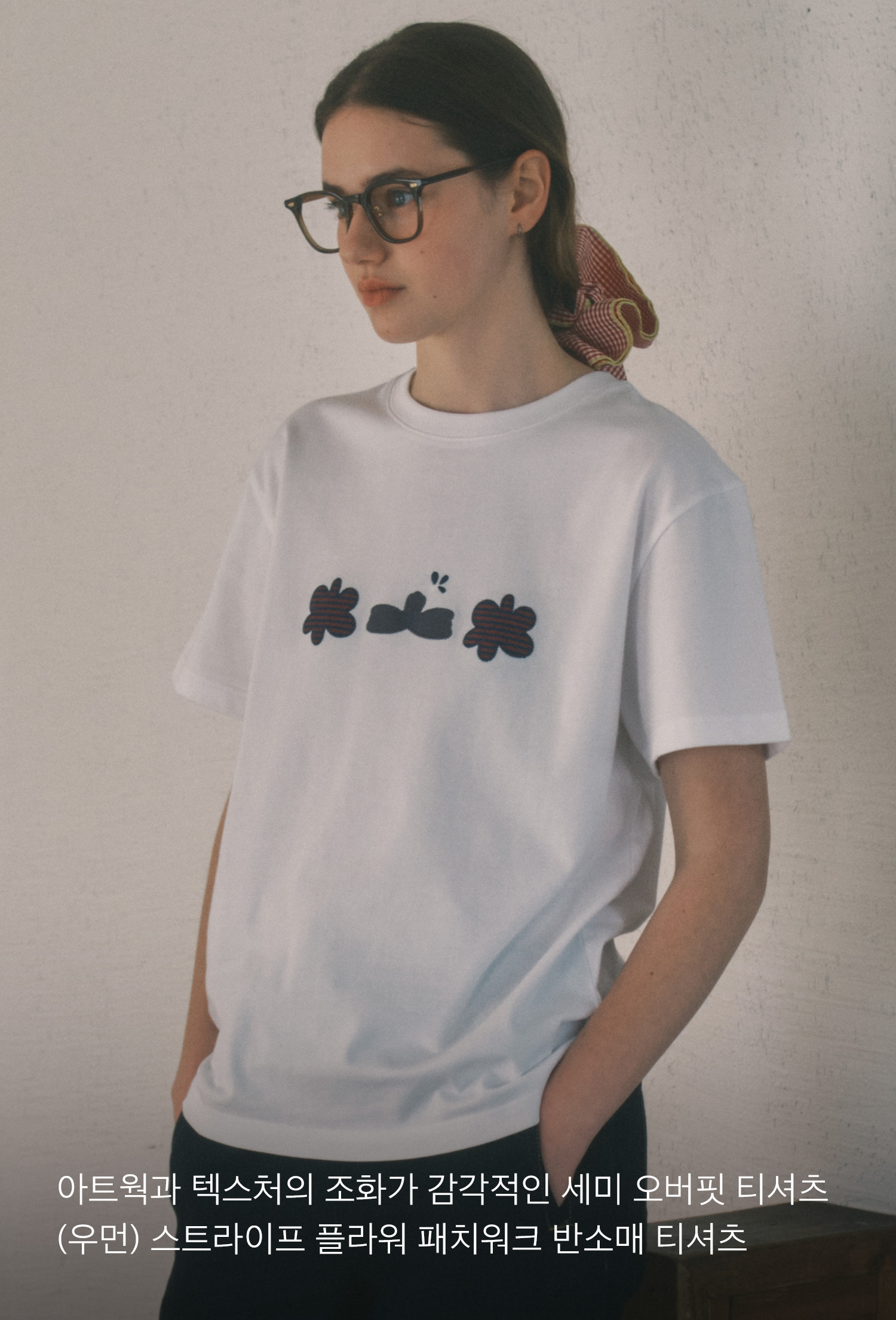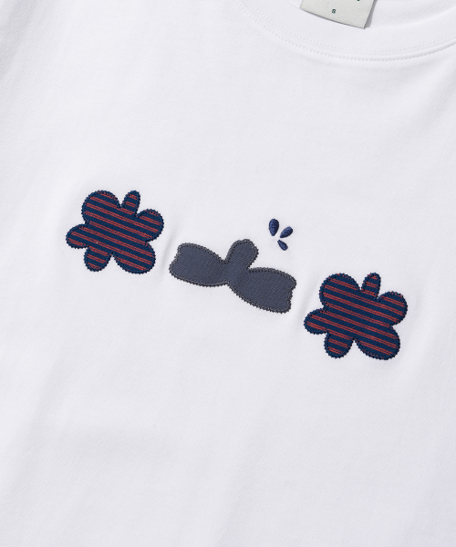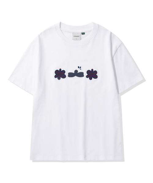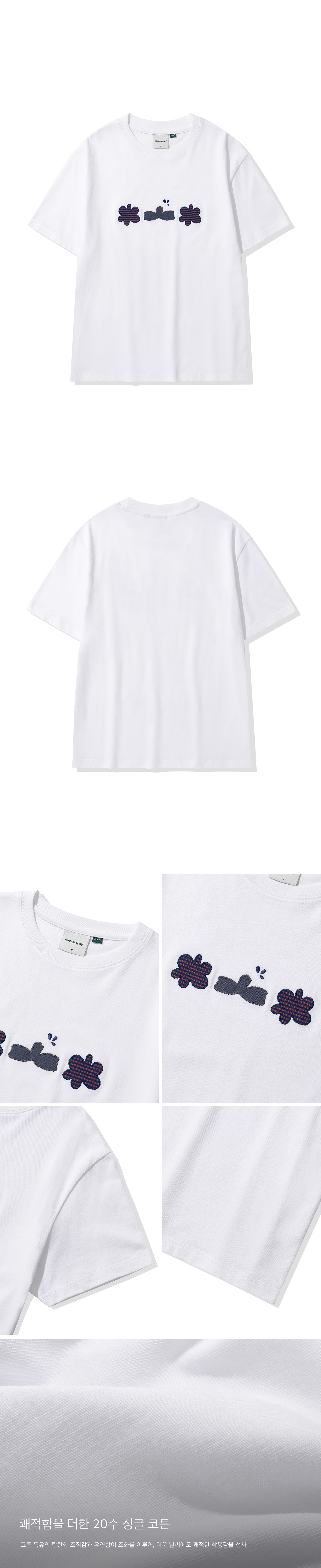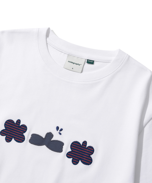 (우먼) 스트라이프 플라워 패치워크 반소매 티셔츠_화이트