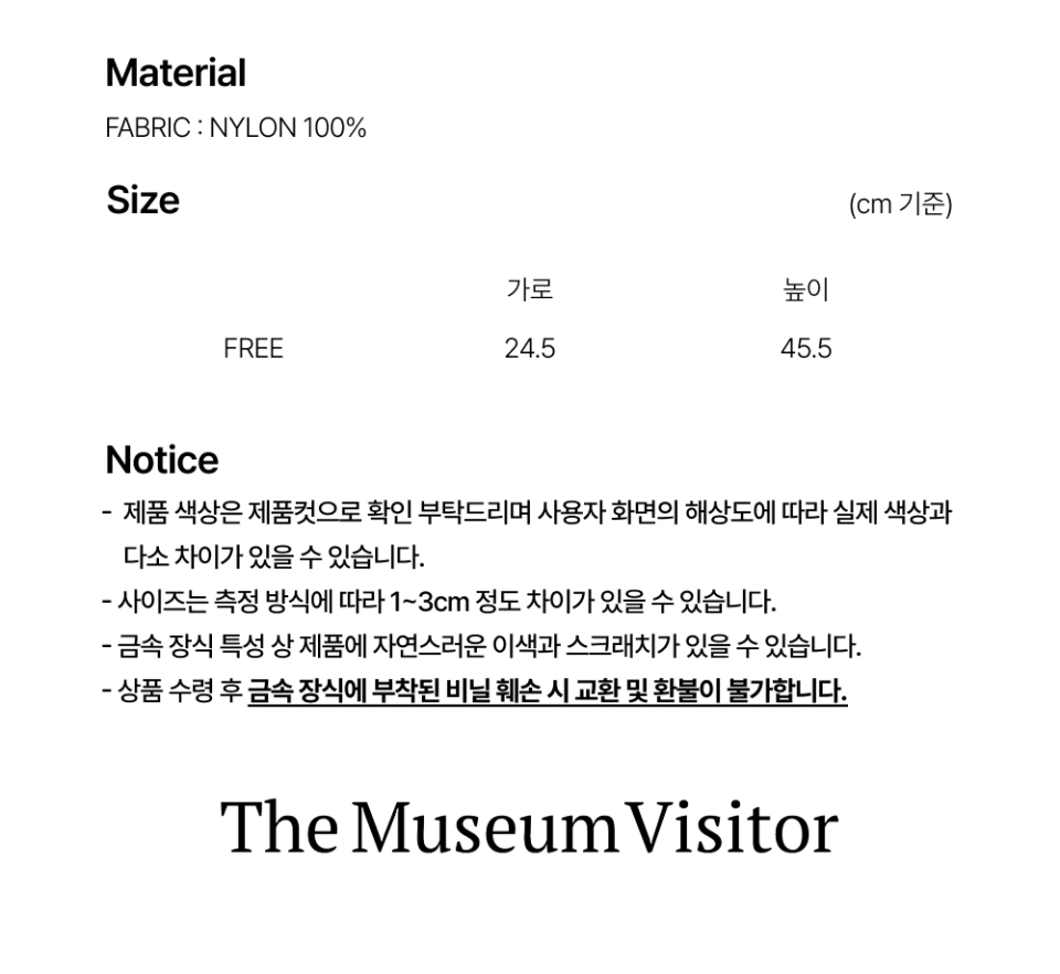 더뮤지엄비지터(THE MUSEUM VISITOR)는 2016년 디렉터 박문수의 독일 베를린 여정에서부터 시작된 브랜드입니다. 거리와 사람들에게서 느낀 자유와 사랑, 행복, 예술이 담긴 도시에서 받은 영감을 많은 이들에게 전하고자 합니다. 주로 꽃과 하트, 자연, 아이들이 디자인적 요소로 나타나며, 수작업이 가미된 차별적인 디자인 덕에 많은 마니아층의 사랑을 받고 있습니다.