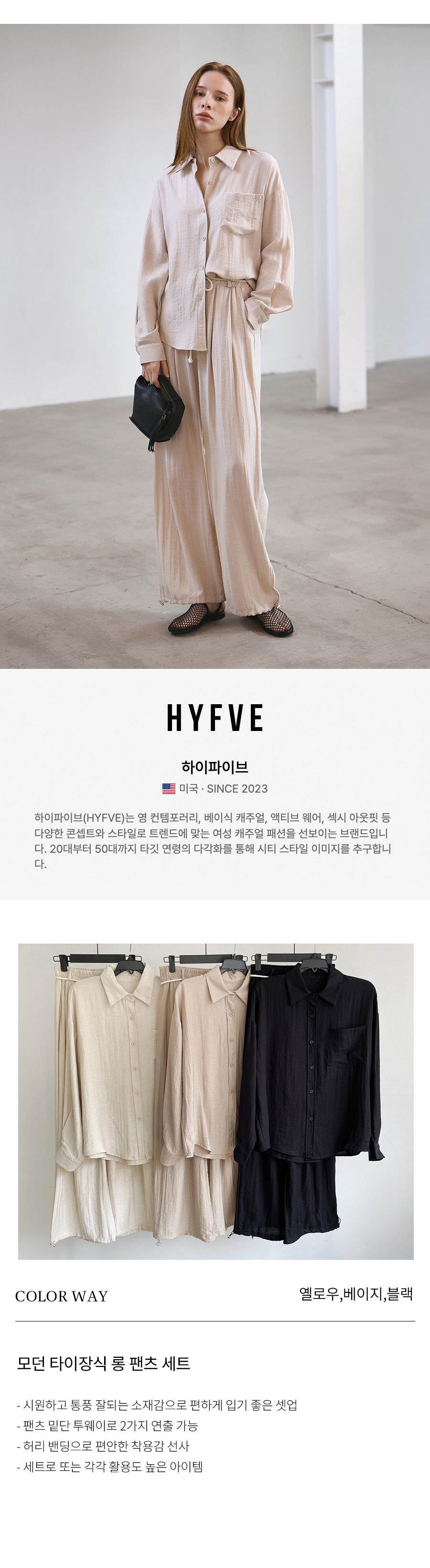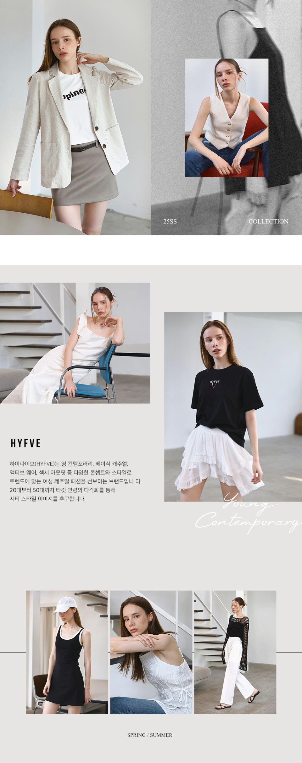 하이파이브(HYFVE)는 영 컨템포러리, 베이식 캐주얼, 액티브 웨어, 섹시 아웃핏 등 다양한 콘셉트와 스타일로 트렌드에 맞는 여성 캐주얼 패션을 선보이는 브랜드입니다. 20대부터 50대까지 타깃 연령의 다각화를 통해 시티 스타일 이미지를 추구합니다.