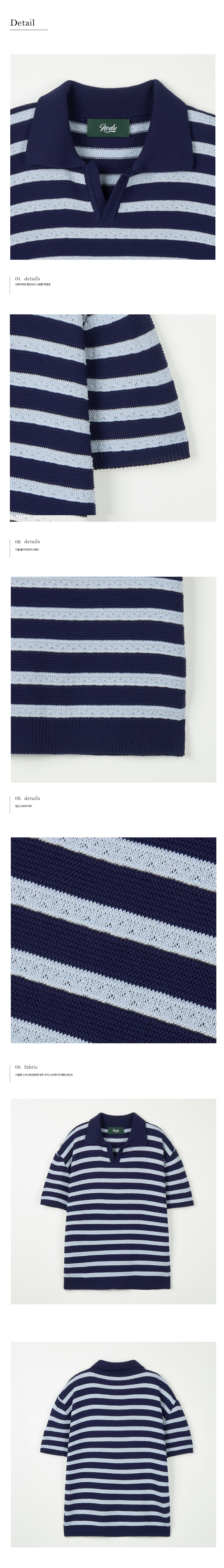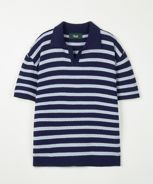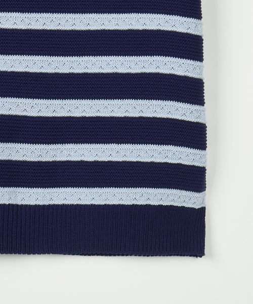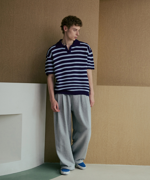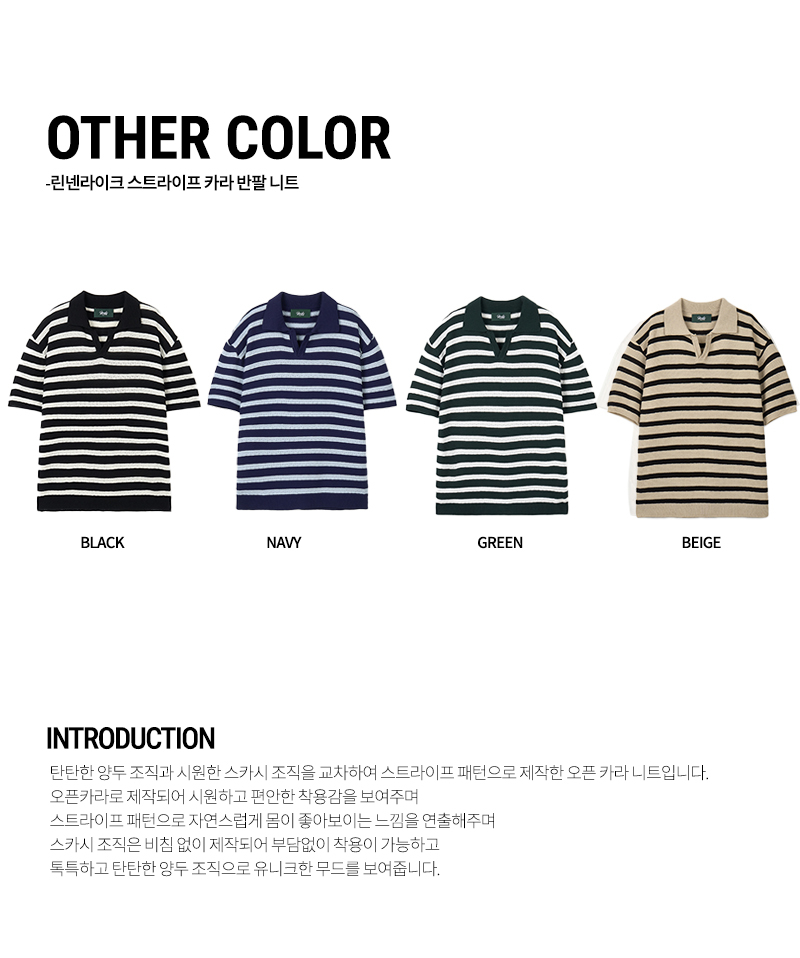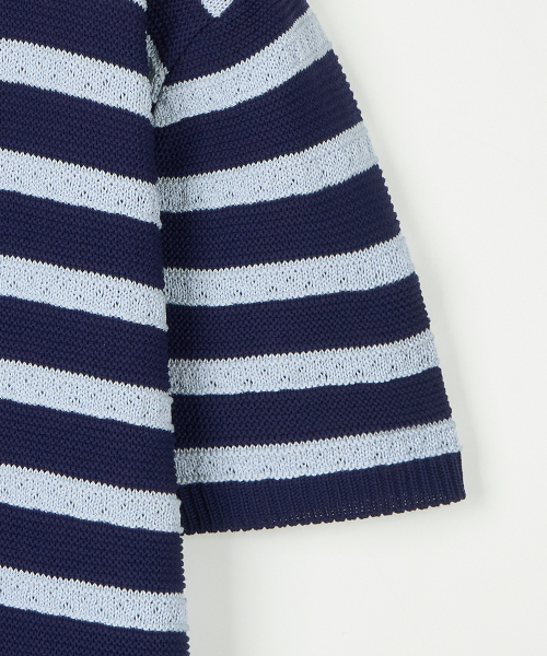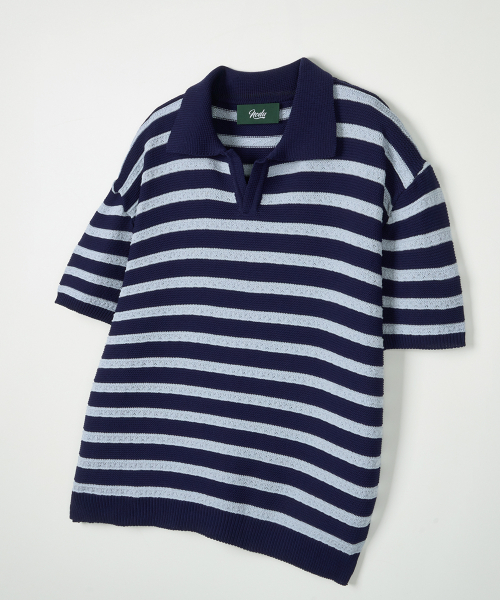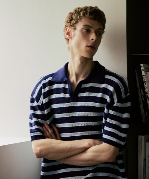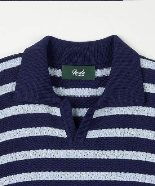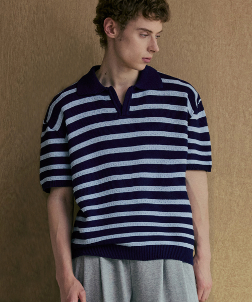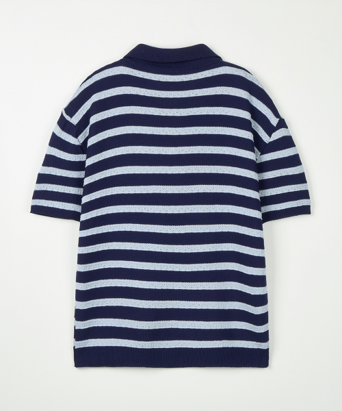 린넨라이크 스트라이프 카라 반팔 니트 [네이비]