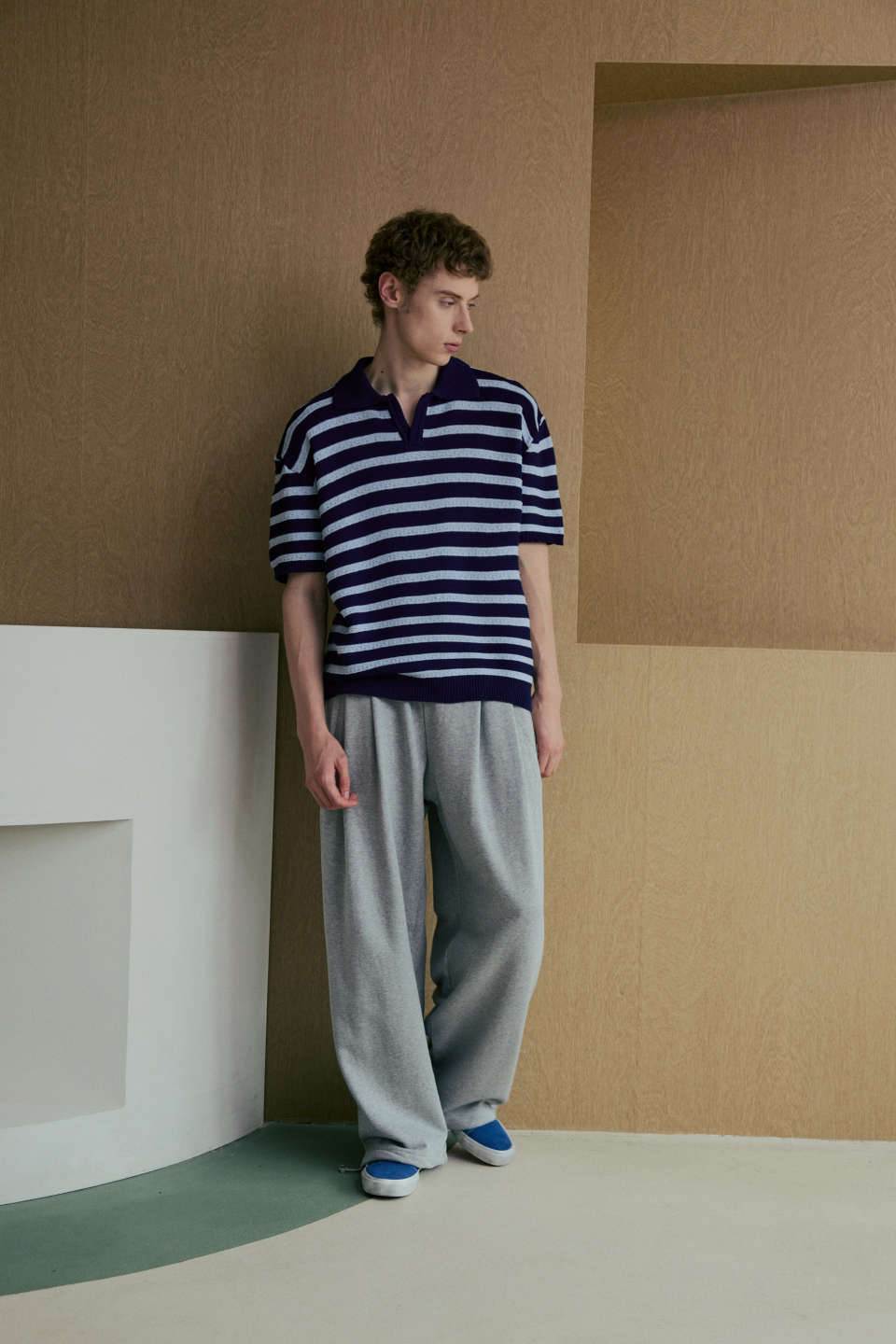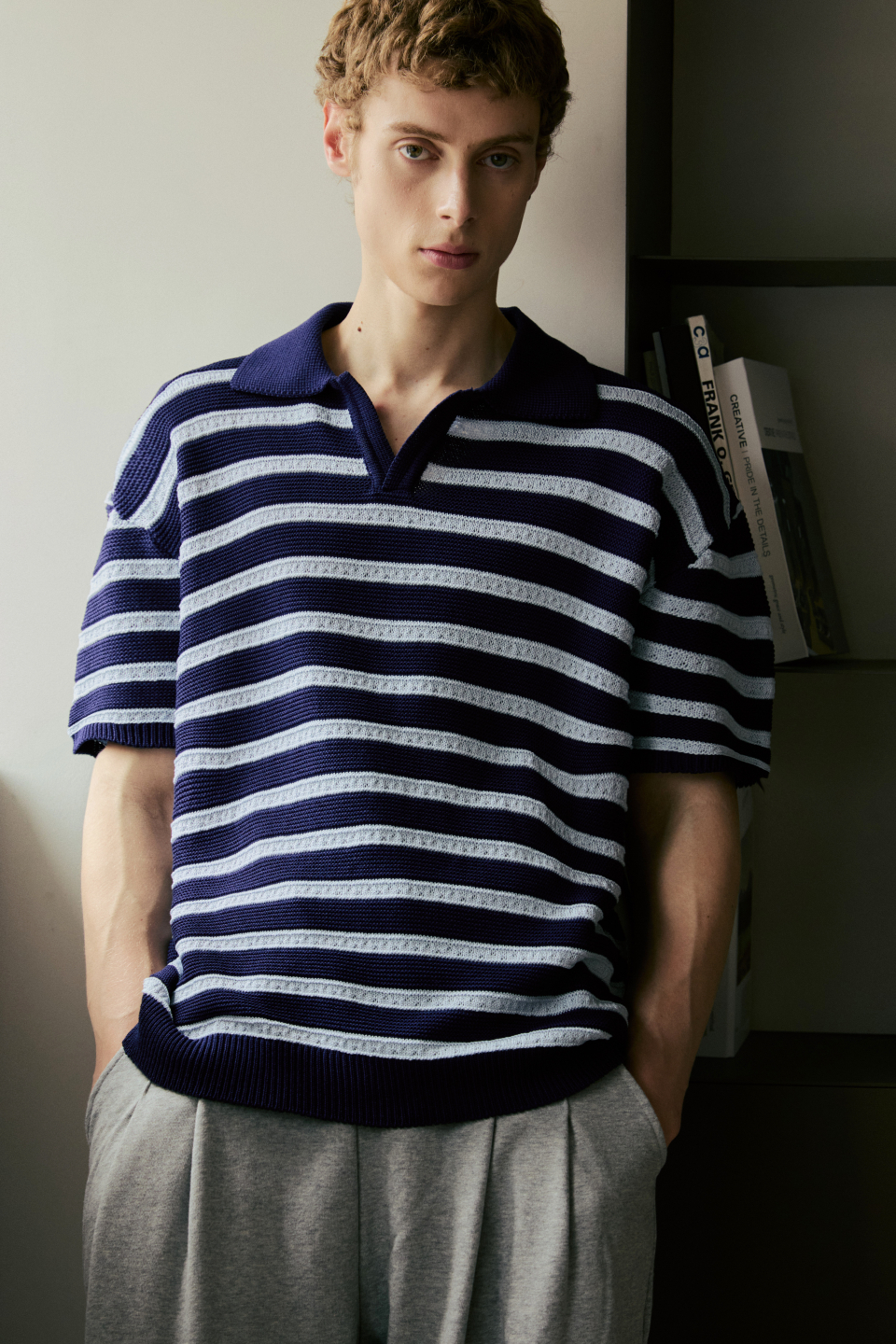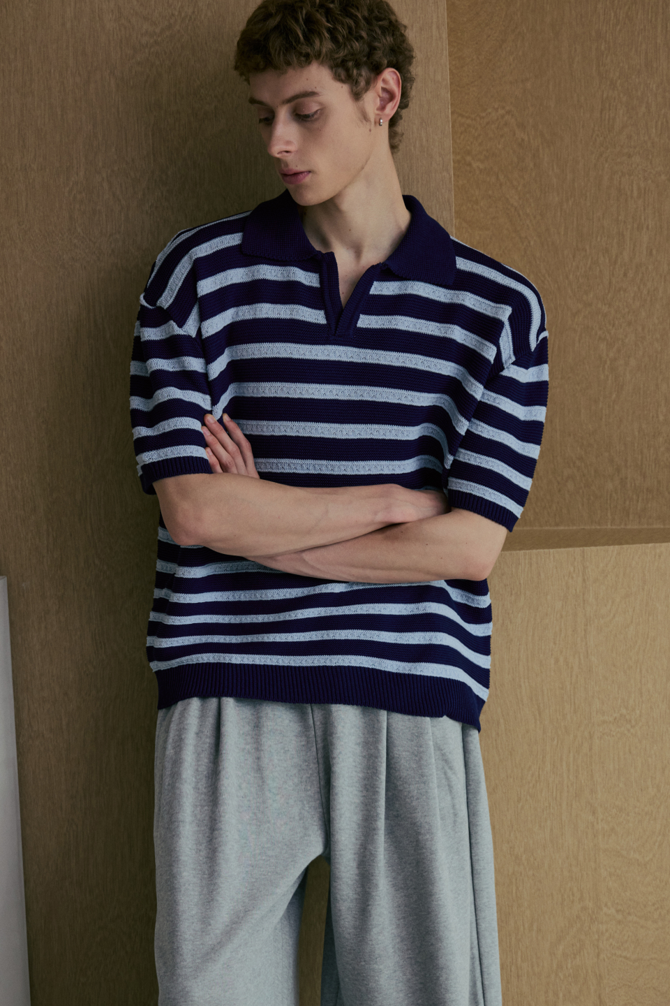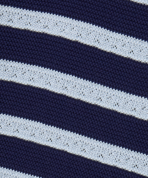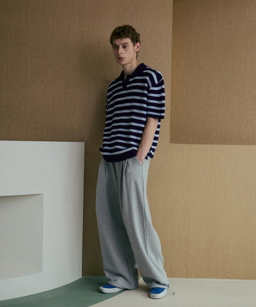 린넨라이크 스트라이프 카라 반팔 니트 [네이비]