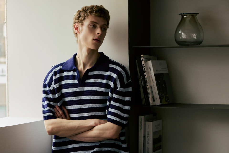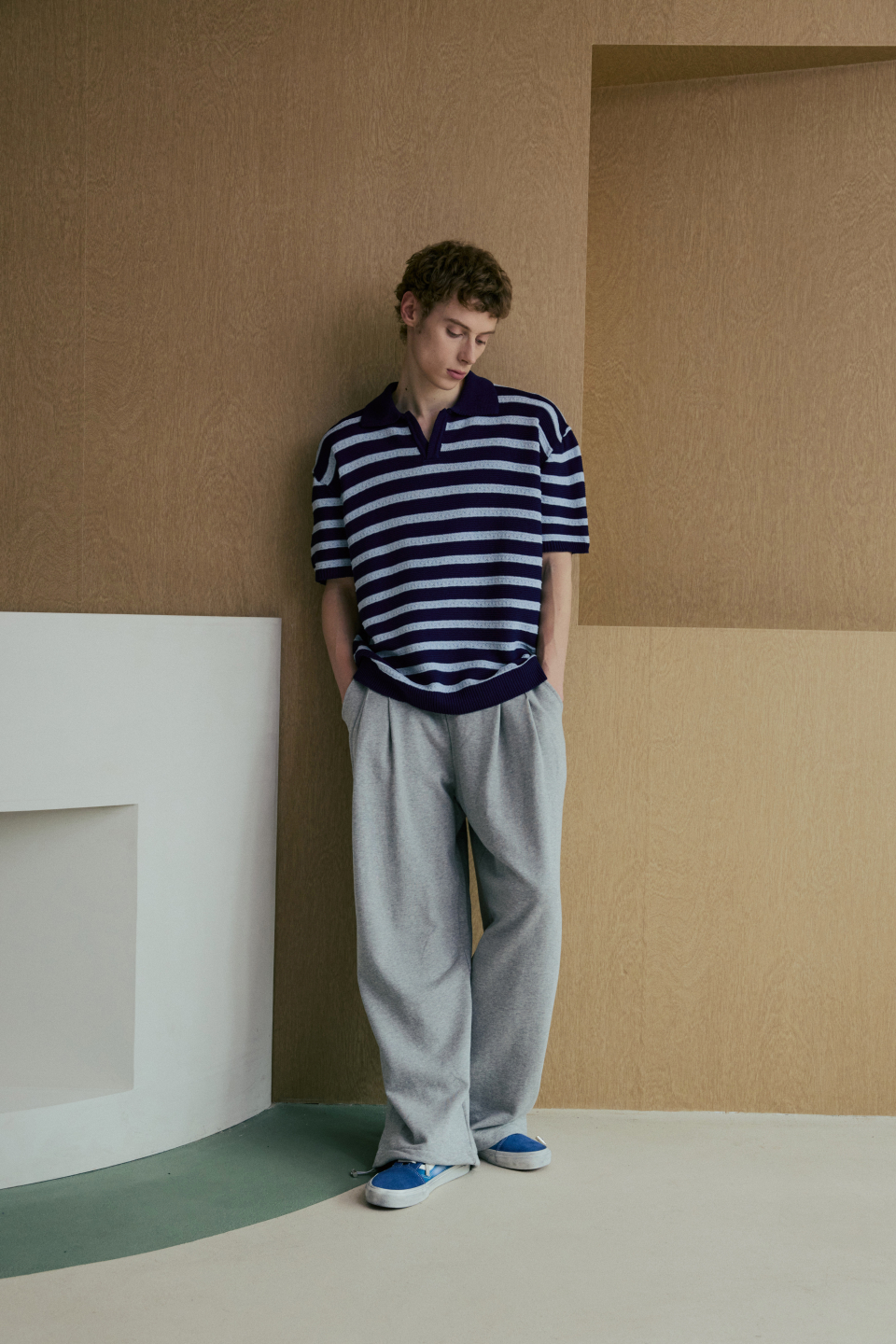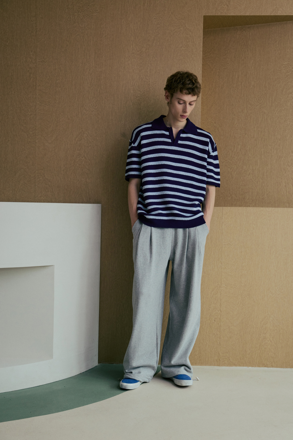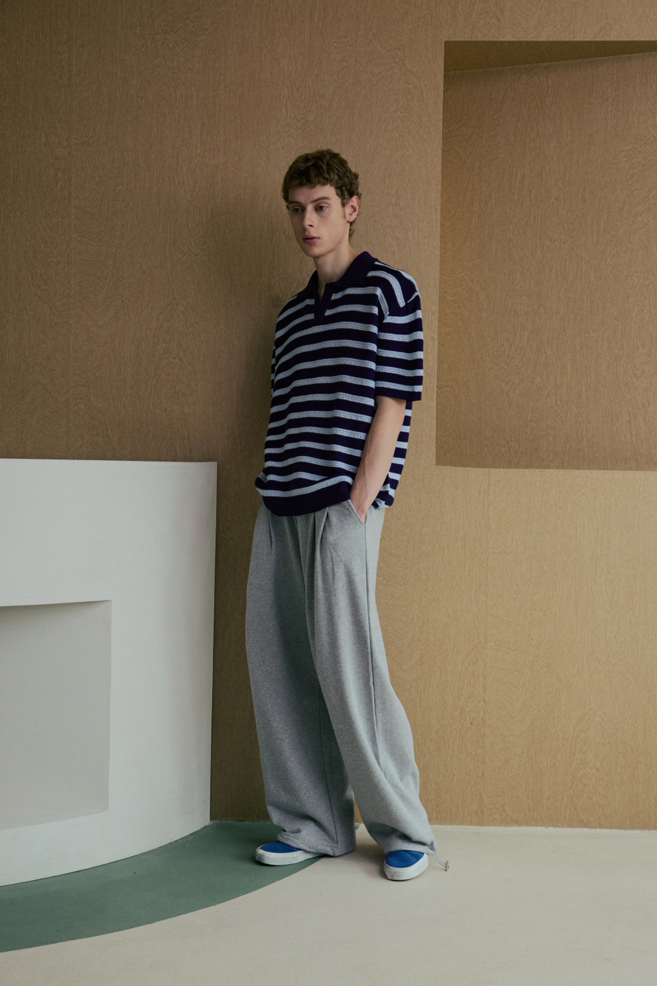 린넨라이크 스트라이프 카라 반팔 니트 [네이비]