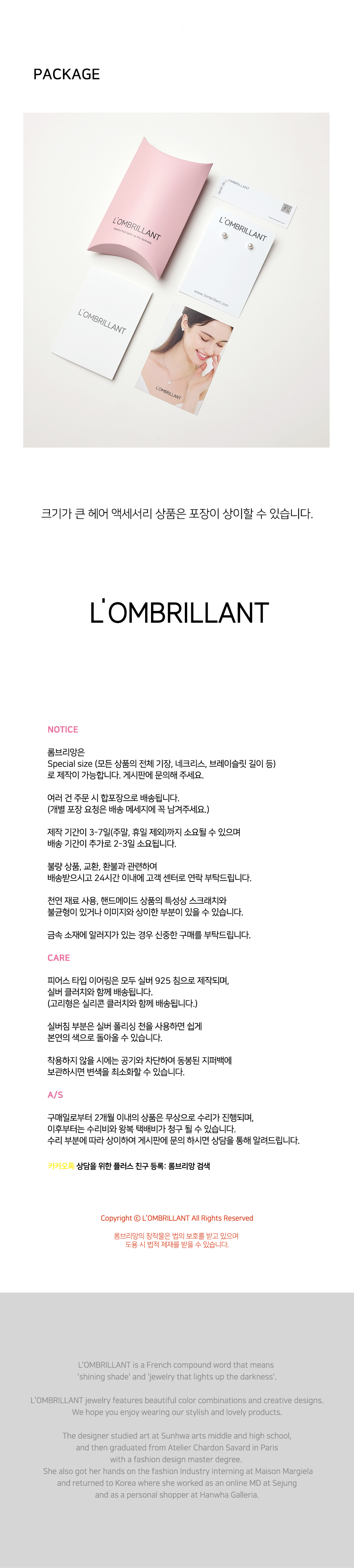 롬브리앙(L'OMBRILLANT)은 '빛나는 그늘'과 '어둠을 밝히는 주얼리'를 뜻하는 불어 합성어입니다. 유니크한 디자인과 함께 천연 재료와 합성 재료가 어우러지며 특유의 독특한 분위기를 자아냅니다.