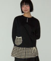 사이드 셔링 체크 배색 프릴 버튼 레이어드 롱슬리브 티셔츠 [블랙]