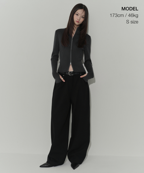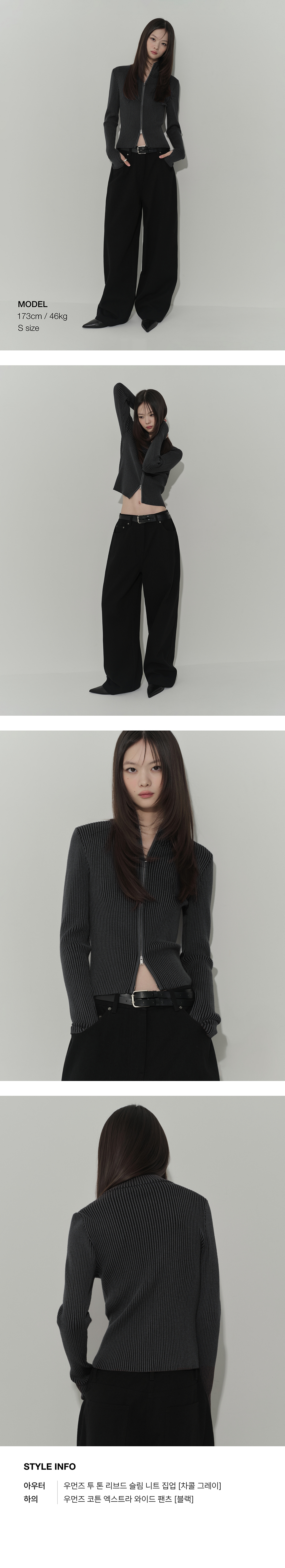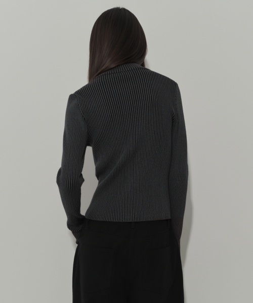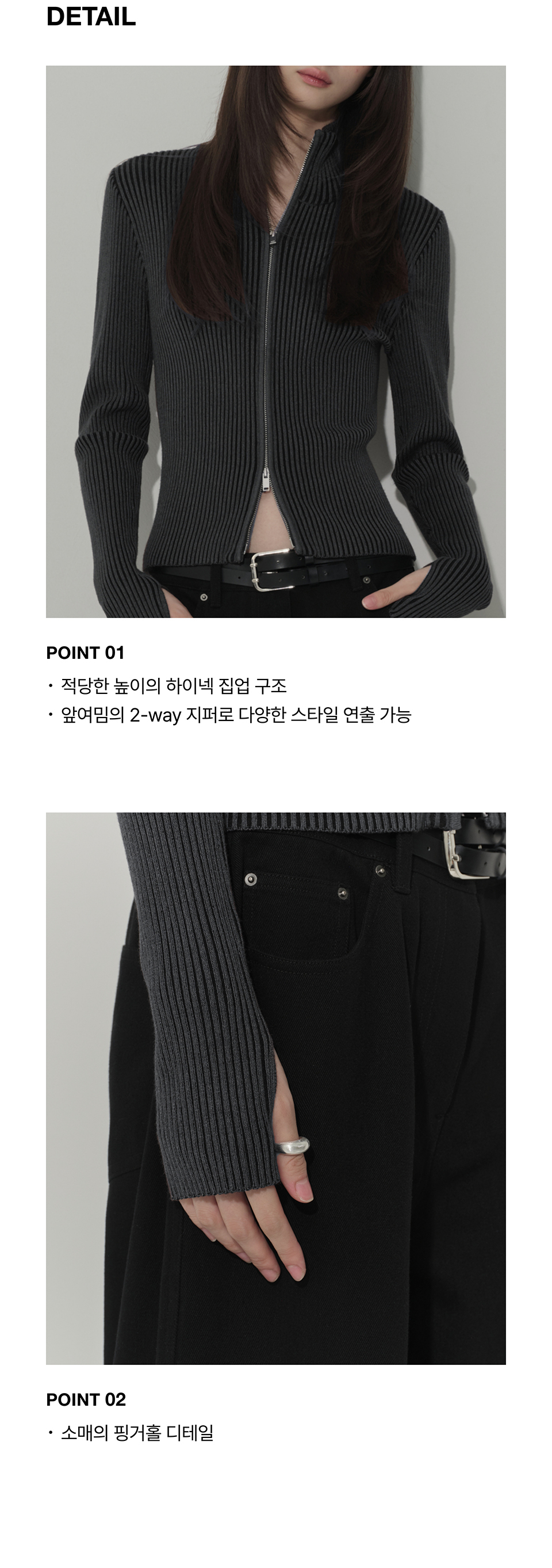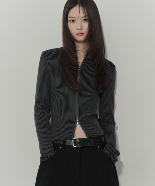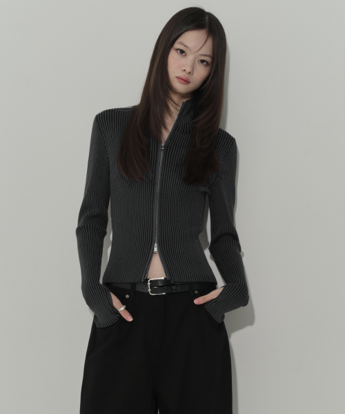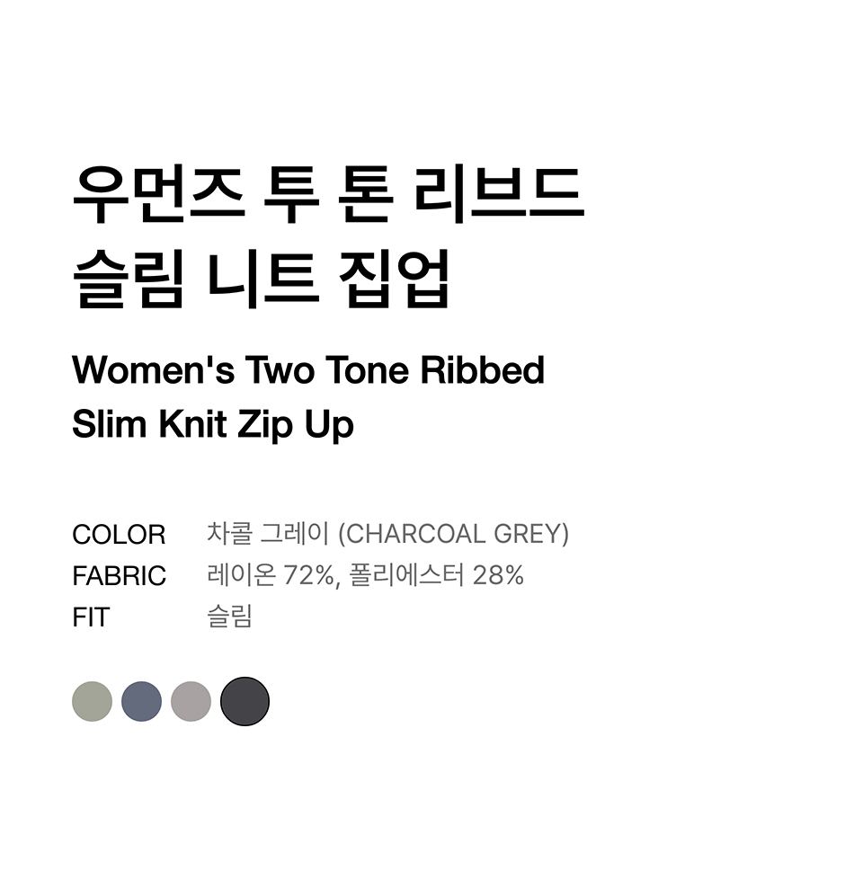 우먼즈 투 톤 리브드 슬림 니트 집업 [차콜 그레이]