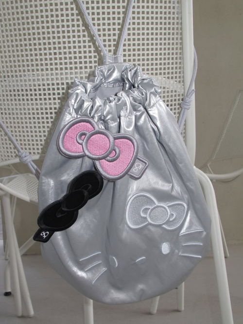 [SET] Hello Kitty Sleek String Backpack Silver+Ribbon Wappen Pink