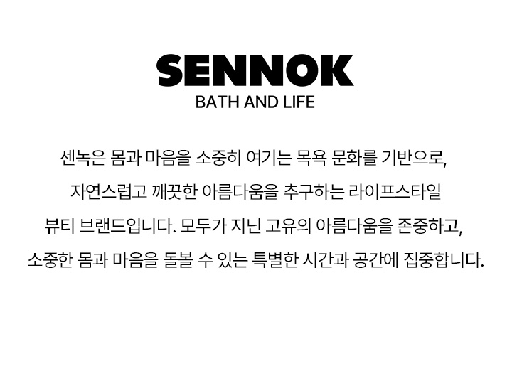 센녹(SENNOK)은 몸과 마음을 소중히 여기는 목욕 문화를 기반으로, 자연스럽고 깨끗한 아름다움을 추구하는 라이프스타일 뷰티 브랜드입니다.
