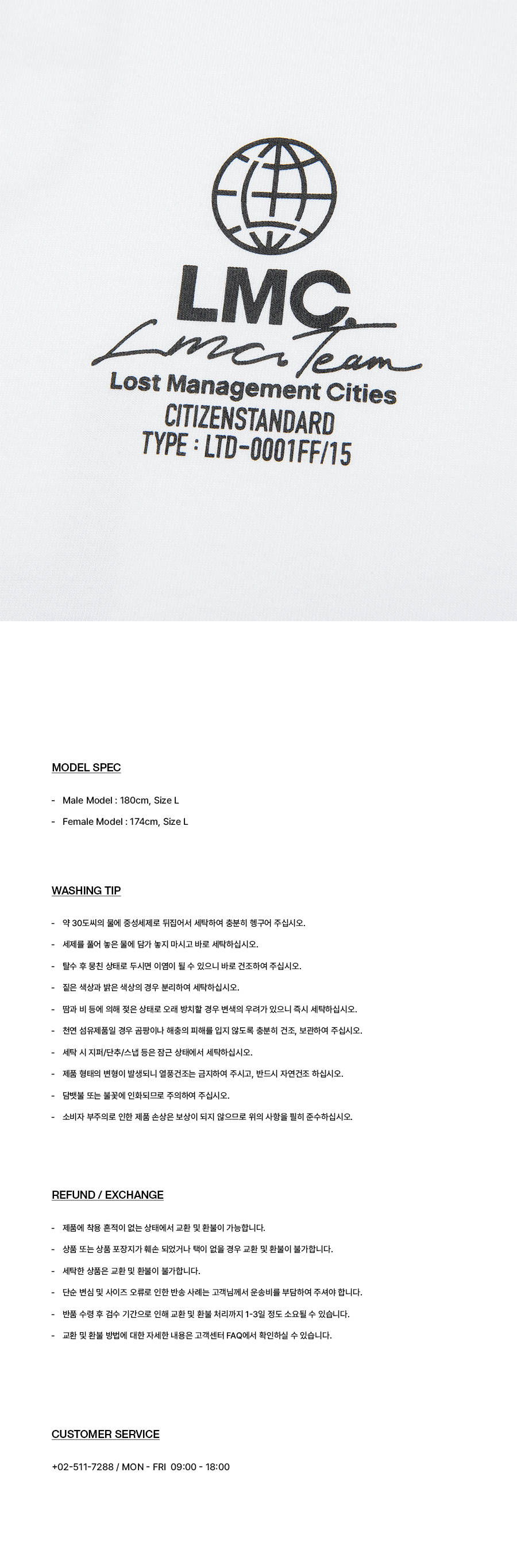 엘엠씨(LMC)는 2015년 론칭하여 ‘Lost Management Cities’를 모티프로 각자의 방식으로 살아가는 세대를 담아내고, 변화하는 환경 속에서 동시대의 문화적 코드를 재해석하며, 다양한 협업과 프로젝트를 통해 스트리트 감성을 확장하는 브랜드입니다.
