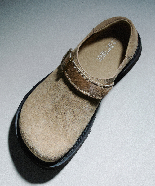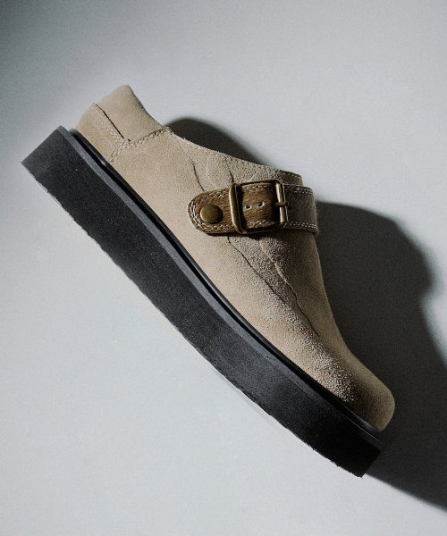 러프한 무드의 스크래치 형압이 새겨진 볼드한 쉐입의 락펑크스타일 클로그 입니다.