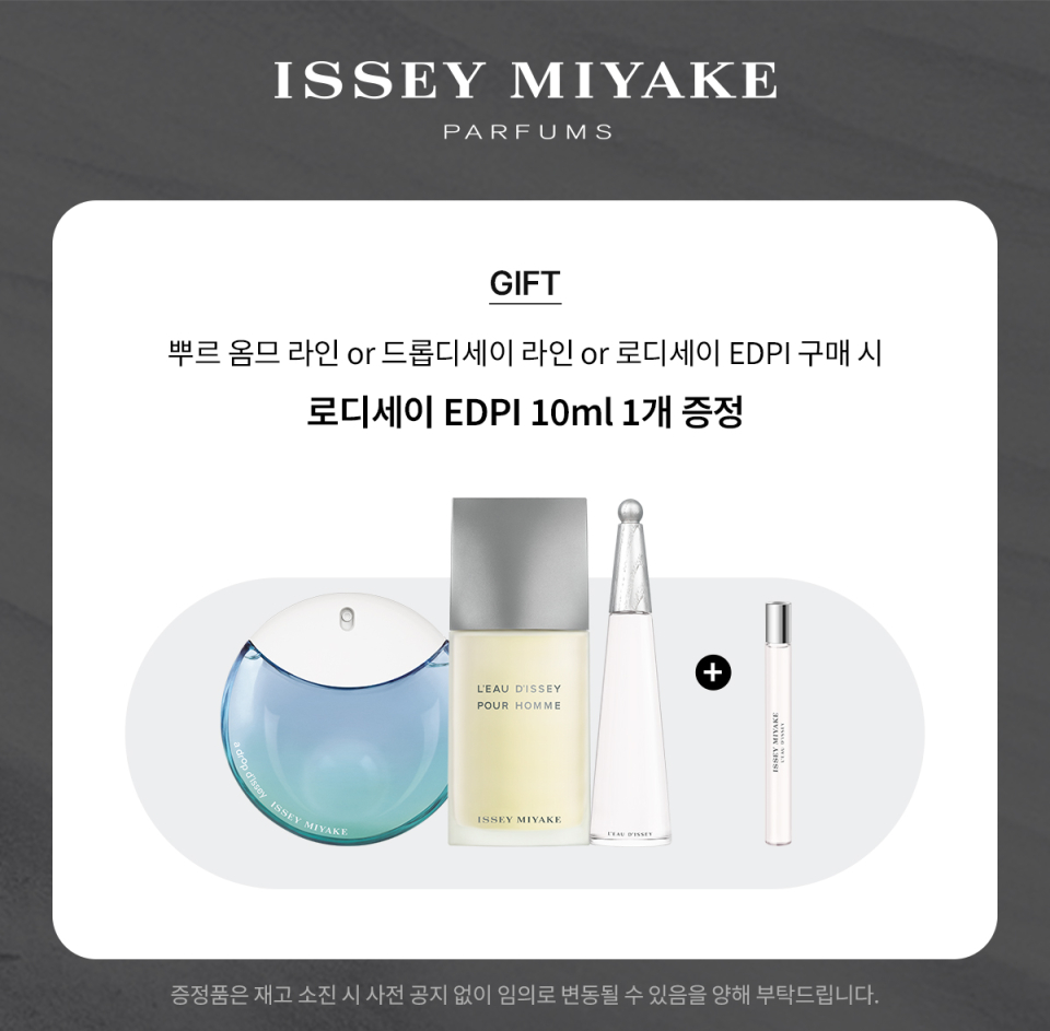 이세이미야케 퍼퓸(ISSEY MIYAKE PERFUME)은 패션과 뷰티는 물론 다양한 카테고리 라인을 선보이는 이세이미야케의 향수 브랜드입니다. 섬세한 우디 향을 담은 옴므 라인이 대표적으로, 자연의 신비로운 매력을 담은 남성 향수 컬렉션을 선보입니다.