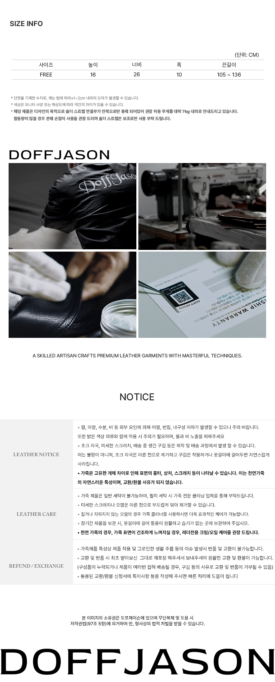 도프제이슨(DOFFJASON)은 가죽이라는 소재에 대한 이해를 기반으로 레더 가먼츠를 중심으로 디자인하는 브랜드입니다. 스타일에 구애받지 않고 오래 입을수록 가치를 더하는 타임리스 디자인을 추구하고, 절제된 디테일과 뛰어난 퀄리티의 아이템을 선보입니다.