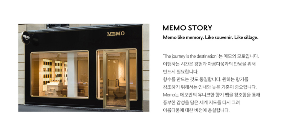 메모파리(MEMO PARIS)는 ‘기억(Memory)’에서 비롯되어 '향기로 이동 없이 여행을 떠날 수 있다'는 철학으로 탄생한 프렌치 프래그런스 하우스입니다. 후각적 기억이 깃든 메모파리만의 섬세하면서도 우아한 향기로 꿈꿔왔던 행선지로 당신만의 여행을 떠나보세요.
