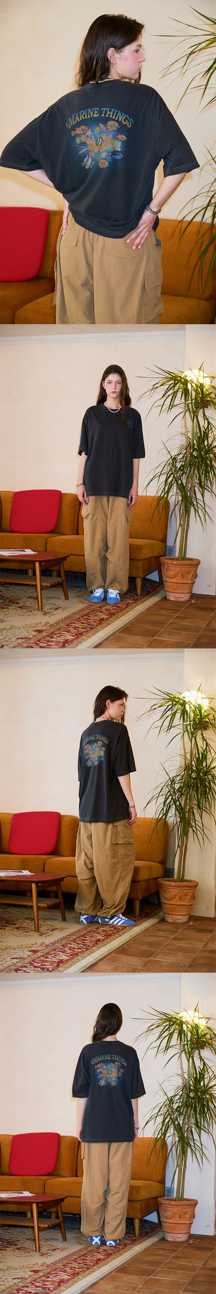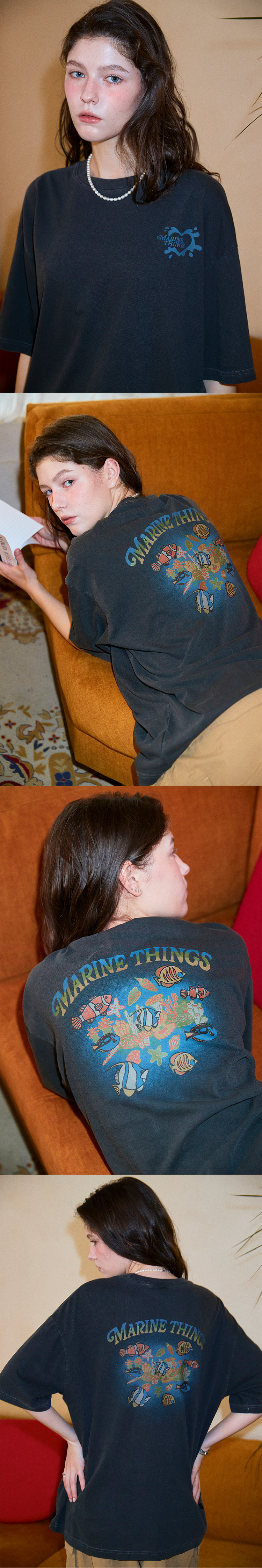 아트웍이 피그먼트 워싱되며 가공 처리하여 유니크한 무드를 연출했습니다.