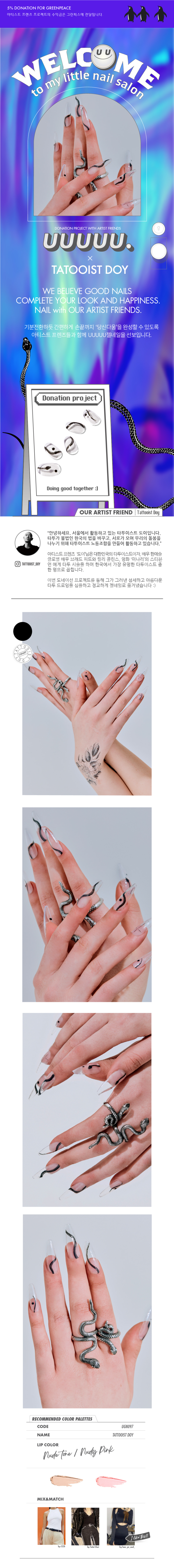 유유유유유(UUUUU.)는 'express U, for U, love U, with U UUUUU.'라는 슬로건 아래, 당신을 위한 쉽고 혁신적이며 감각적인 네일 제품을 선보이는 브랜드입니다.