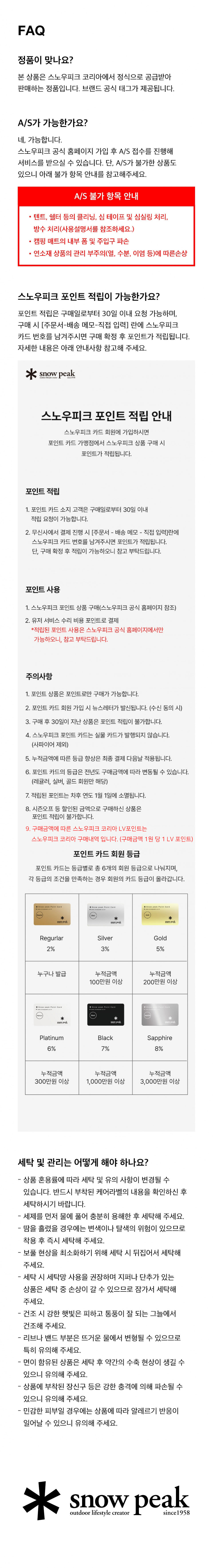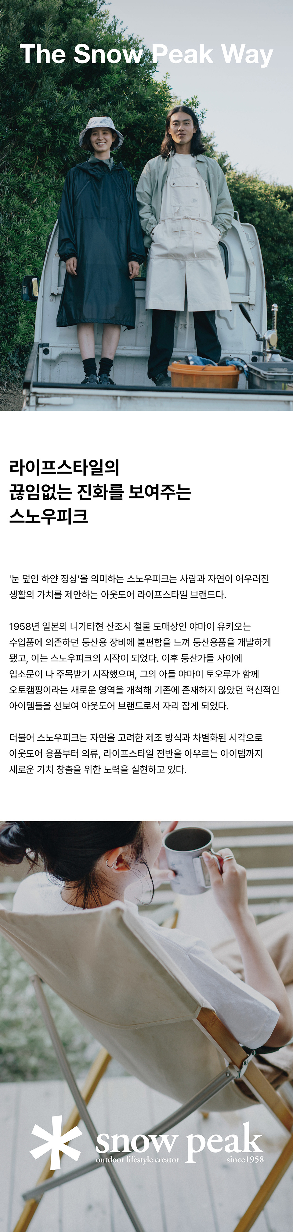 스노우피크는 오토캠핑이라는 분야를 개척한 캠핑씬을 대표하는 브랜드입니다. 캠핑용품 뿐만 아니라, 어패럴, 캠핑 식음료 등 캠핑 문화 전체에 영향을 주는 리딩 브랜드입니다.