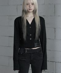 Back Diagonal Eyelet Collarless Crop Jacket (Black)