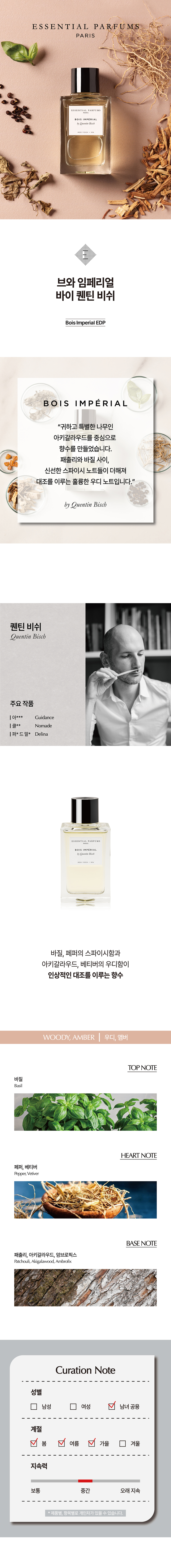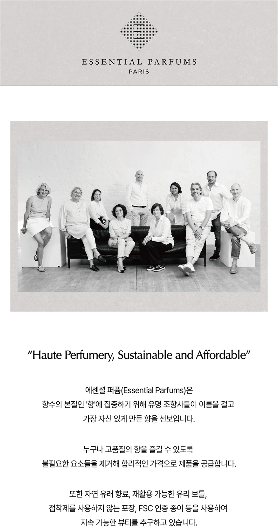 에센셜 퍼퓸(ESSENTIAL PARFUMS)은 향수를 창조하는 숨은 주인공인 '조향사'들이 자신 있게 만든 향수를 선보이는 브랜드입니다. 기존 향수 시장 구조에 만연한 과도한 마케팅, 유통 구조의 거품을 빼고, 향수 그 자체에만 집중합니다. 자연 원료, 지속가능성, 환경을 생각한 업사이클링 등으로 향수 시장의 판도를 바꾸고자 합니다.