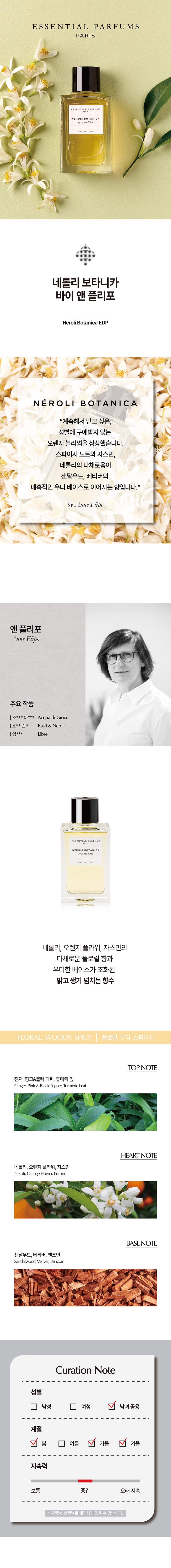 에센셜 퍼퓸(ESSENTIAL PARFUMS)은 향수를 창조하는 숨은 주인공인 '조향사'들이 자신 있게 만든 향수를 선보이는 브랜드입니다. 기존 향수 시장 구조에 만연한 과도한 마케팅, 유통 구조의 거품을 빼고, 향수 그 자체에만 집중합니다. 자연 원료, 지속가능성, 환경을 생각한 업사이클링 등으로 향수 시장의 판도를 바꾸고자 합니다.