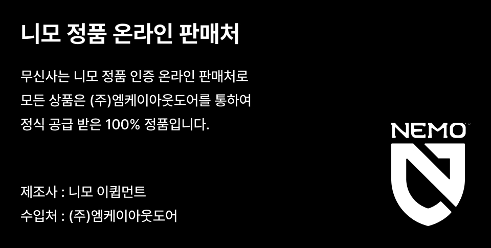 니모(NEMO)는 미국 프리미엄 캠핑 기어 전문 브랜드입니다. 지금껏 누구도 만들지 못했던 편리한 제품을 디자인합니다. 더 많은 시간과 체력을 탐험과 휴식에 전념하고 지속 가능한 환경이 유지될 수 있도록 탄소 배출 저감에 진심인 프리미엄 캠핑 기어 브랜드입니다.
