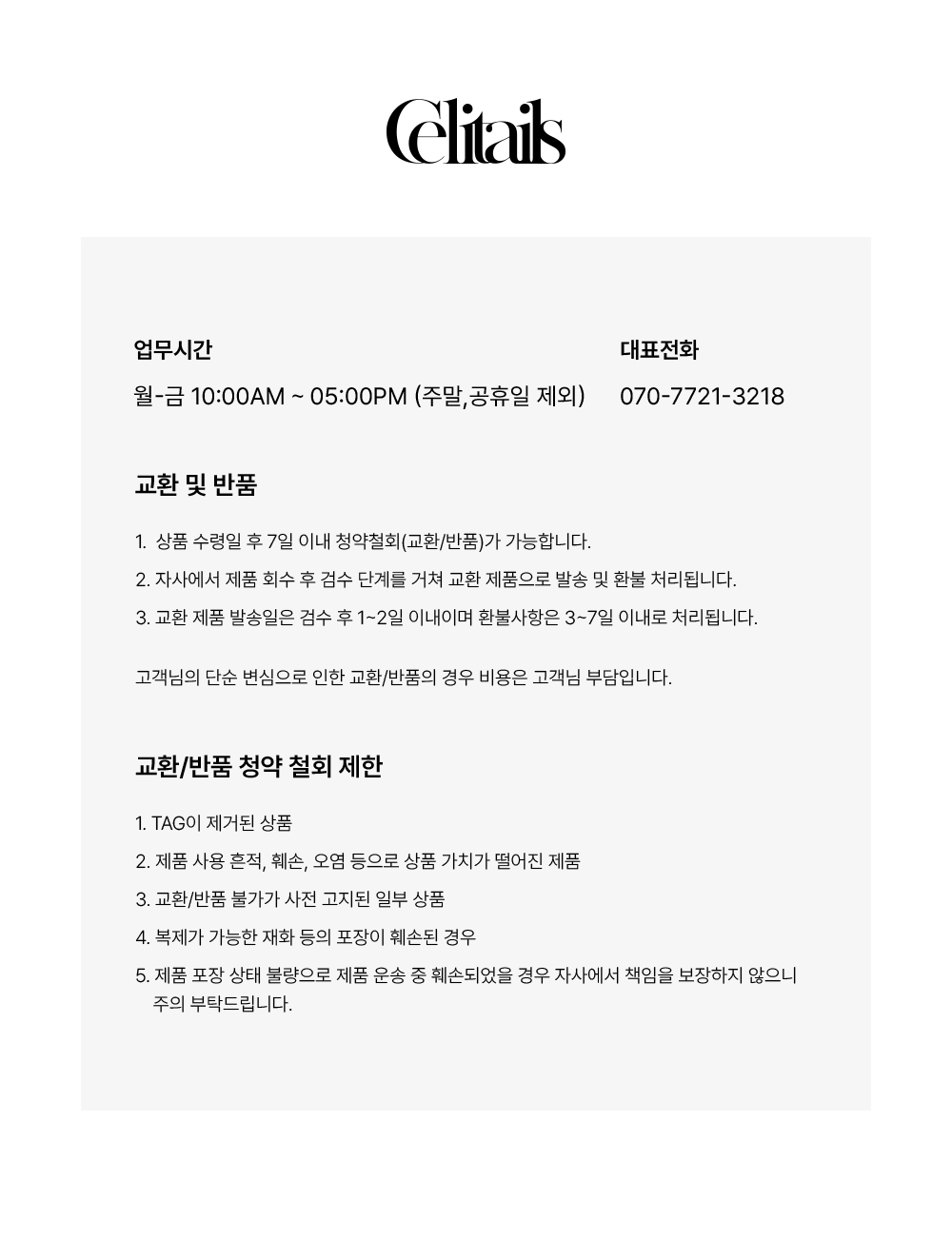 셀리테일즈(CELITAILS)는 러블리한 무드에 로맨틱한 디테일을 더해, 감각적인 실루엣과 다채로운 컬러로 일상에 설렘과 특별함을 전하는 브랜드입니다.