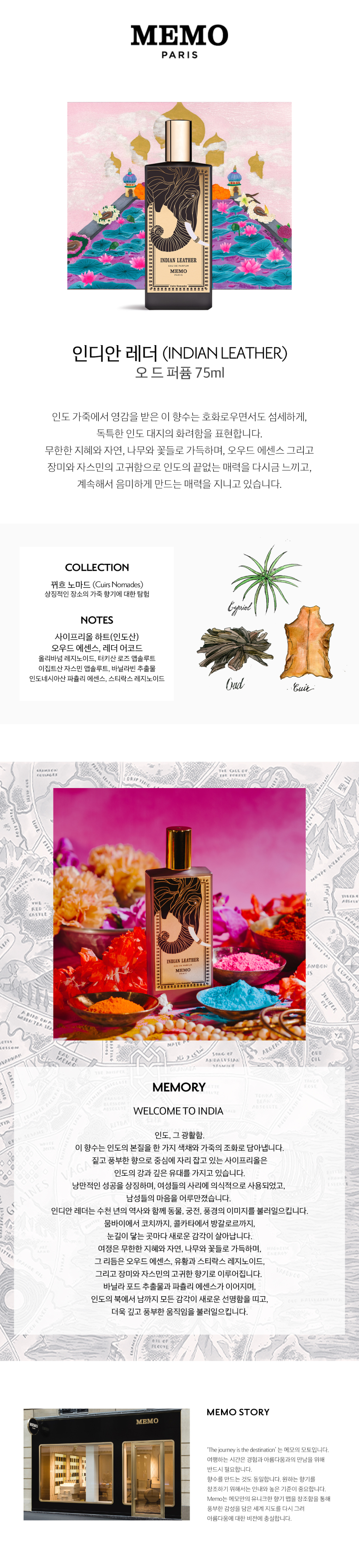 메모파리(MEMO PARIS)는 ‘기억(Memory)’에서 비롯되어 '향기로 이동 없이 여행을 떠날 수 있다'는 철학으로 탄생한 프렌치 프래그런스 하우스입니다. 후각적 기억이 깃든 메모파리만의 섬세하면서도 우아한 향기로 꿈꿔왔던 행선지로 당신만의 여행을 떠나보세요.