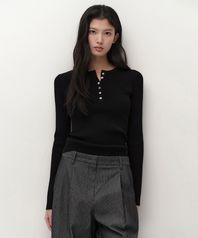 우먼즈 리브드 슬림 헨리 넥 니트 [블랙]