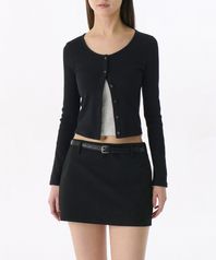 우먼즈 리브드 슬림 라운드 넥 저지 가디건 [블랙]
