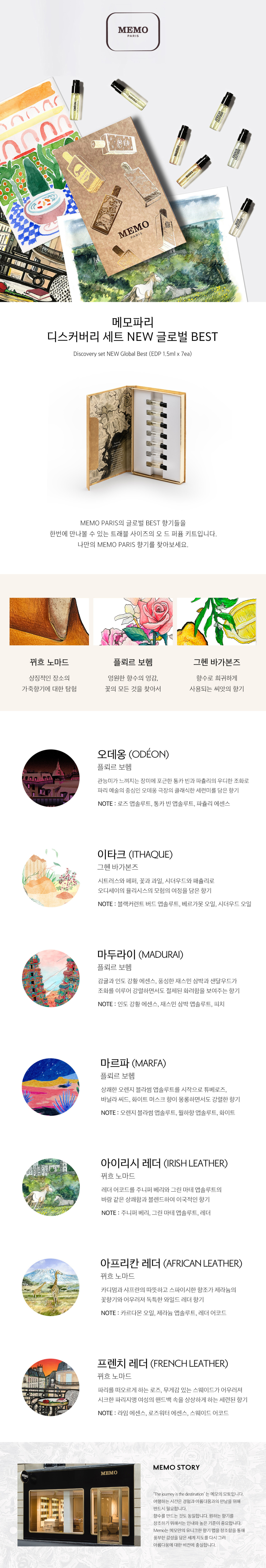 메모파리(MEMO PARIS)는 ‘기억(Memory)’에서 비롯되어 '향기로 이동 없이 여행을 떠날 수 있다'는 철학으로 탄생한 프렌치 프래그런스 하우스입니다. 후각적 기억이 깃든 메모파리만의 섬세하면서도 우아한 향기로 꿈꿔왔던 행선지로 당신만의 여행을 떠나보세요.