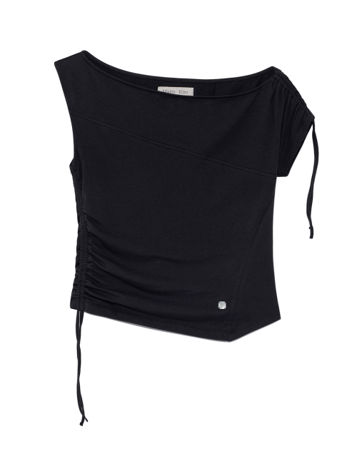 앞판의 사선절개가 포인트이며 스트링으로 다양한 연출이 가능한 오프숄더 탑