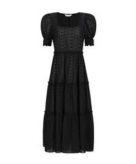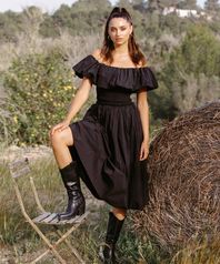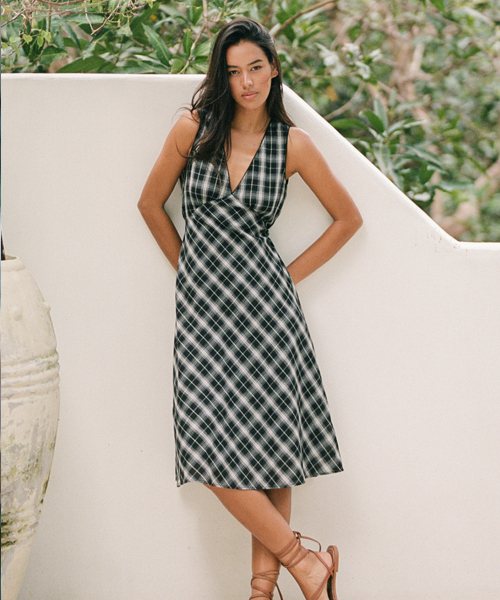 - 깊게 파인 브이넥에 얇은 피코 레이스를 더한 클래식한 체크 패턴의 미디 드레스