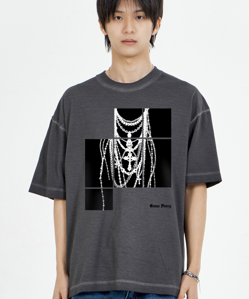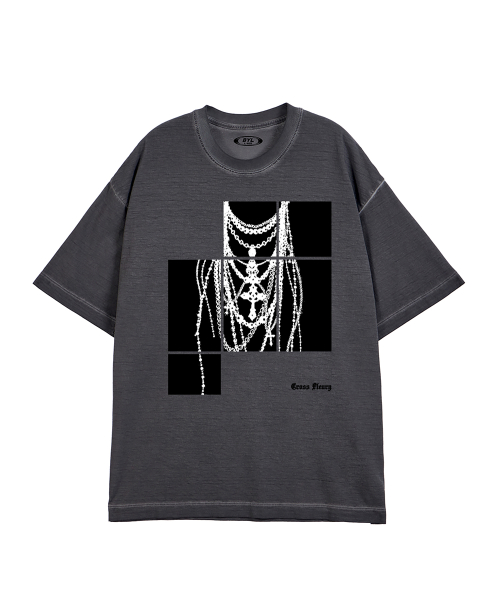 넥레이스 프린팅 반팔티 피그먼트 차콜