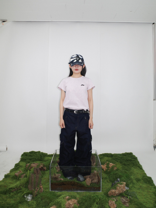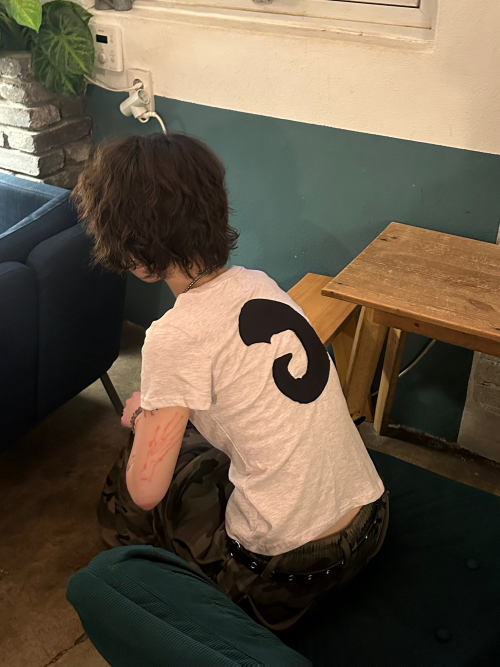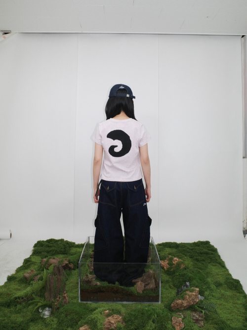 후면에 대비되는 원단을 사용한 아플리케 자수와 러프한 마감 가슴에 브랜드 로고 자수